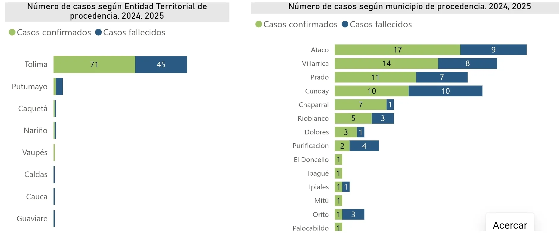 El departamento del Tolima se ha consolidado como el epicentro de la crisis, con 71 casos confirmados y 45 fallecidos, de un total de 116 casos reportados en ese territorio, superando con creces a otras entidades como Putumayo, Caquetá, Nariño y Vaupés, que también registran brotes.