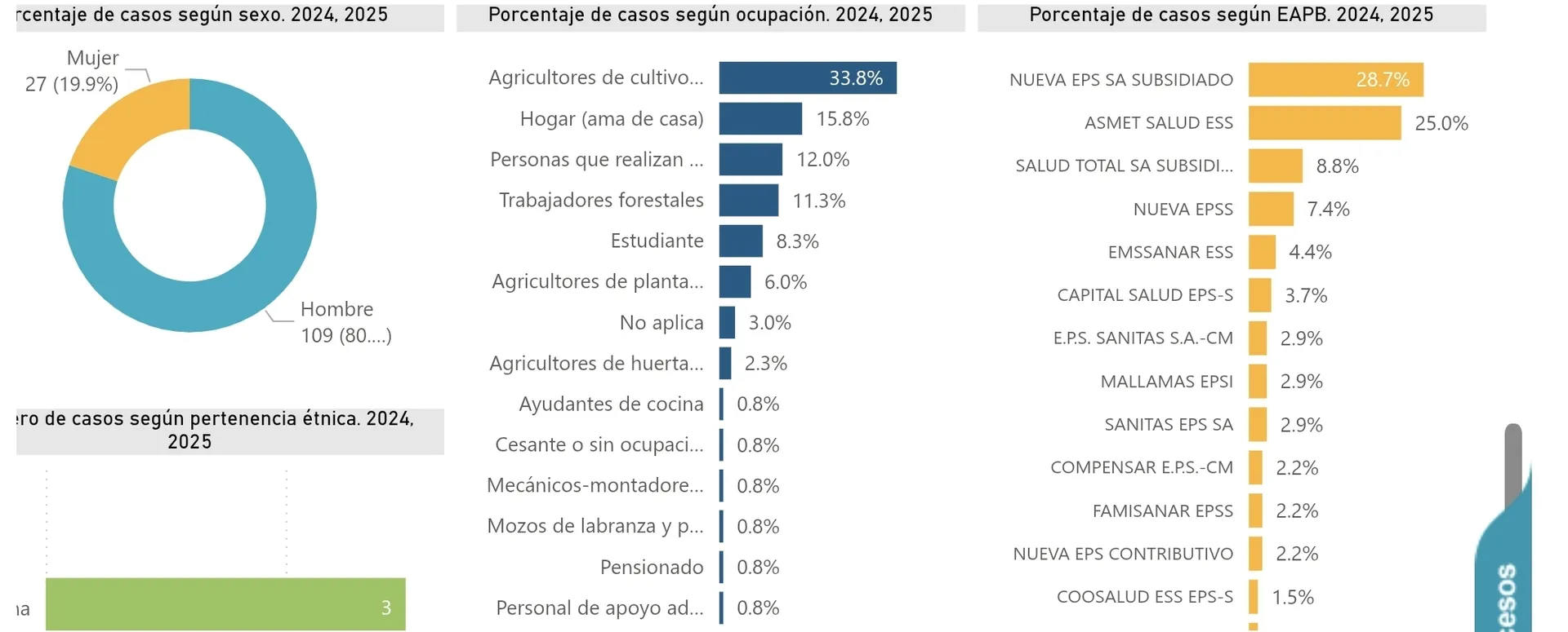 La mayoría de los afectados son población de estrato socioeconómico 1 (85.7%) y afiliados al régimen de salud Subsidiado (93.4%), con la ocupación de agricultores de cultivo como la más frecuente (33.8%). El Ministerio de Salud insta a la vacunación urgente y al control vectorial.