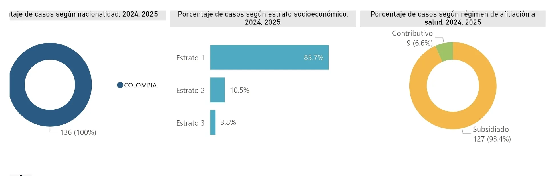 El análisis de las víctimas revela un patrón social preocupante: el 85.7% de los casos corresponden a personas de Estrato Socioeconómico 1, y un abrumador 93.4% de los afectados está afiliado al régimen de salud Subsidiado, lo que confirma la vulnerabilidad de las poblaciones de bajos ingresos y con limitado acceso a la salud preventiva.