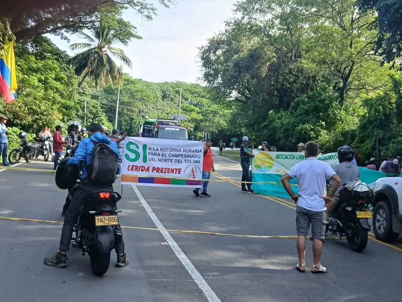 Desde las primeras horas de este lunes, campesinos afiliados a la Asociación Agropecuaria Regional del Norte del Tolima (Asoagronortol) mantienen bloqueada la vía que comunica Líbano, Armero y Lérida. El cierre se ha establecido en el cruce de Armero como medida de presión para que el Gobierno Nacional atienda sus peticiones relacionadas con la entrega de tierras.