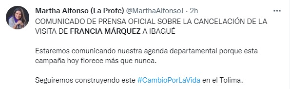 Desde la coordinación Nacional del equipo tierra campaña vicepresidencial de Francia Márquez firmada por Camilo Ernesto chica, se conoció el comunicado dónde informa que por cambios de último momento de los compromisos de campaña la visita la ciudad de ibagué programada para el día de mañana debe ser cancelada. Desde luego agradecer De antemano Su comprensión Esperando poder visitar la ciudad musical próximamente.