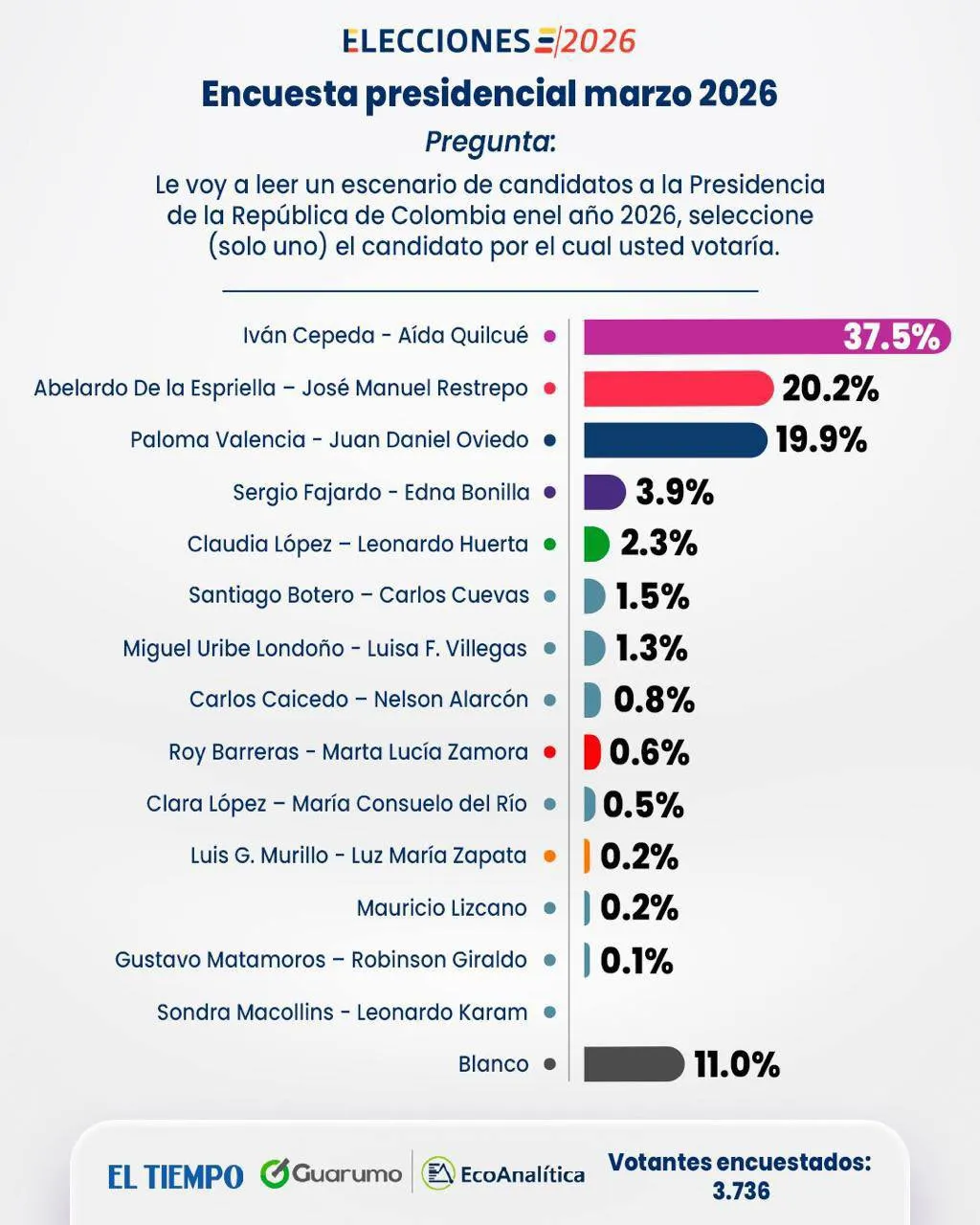 Una nueva medición de Guarumo y Ecoanalítica, financiada por El Tiempo, confirma el liderazgo de Iván Cepeda en intención de voto para 2026, mientras Abelardo de la Espriella y Paloma Valencia protagonizan un empate técnico por el segundo lugar.