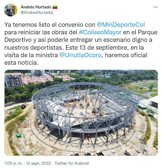 De acuerdo el mandatario local Andrés Fabián Hurtado en un trino del 12 de septiembre del 2022, donde anuncio tener listo el convenio con el Ministerio del Deporte para así realizar las obras del Coliseo mayor que están paradas en el parque deportivo.