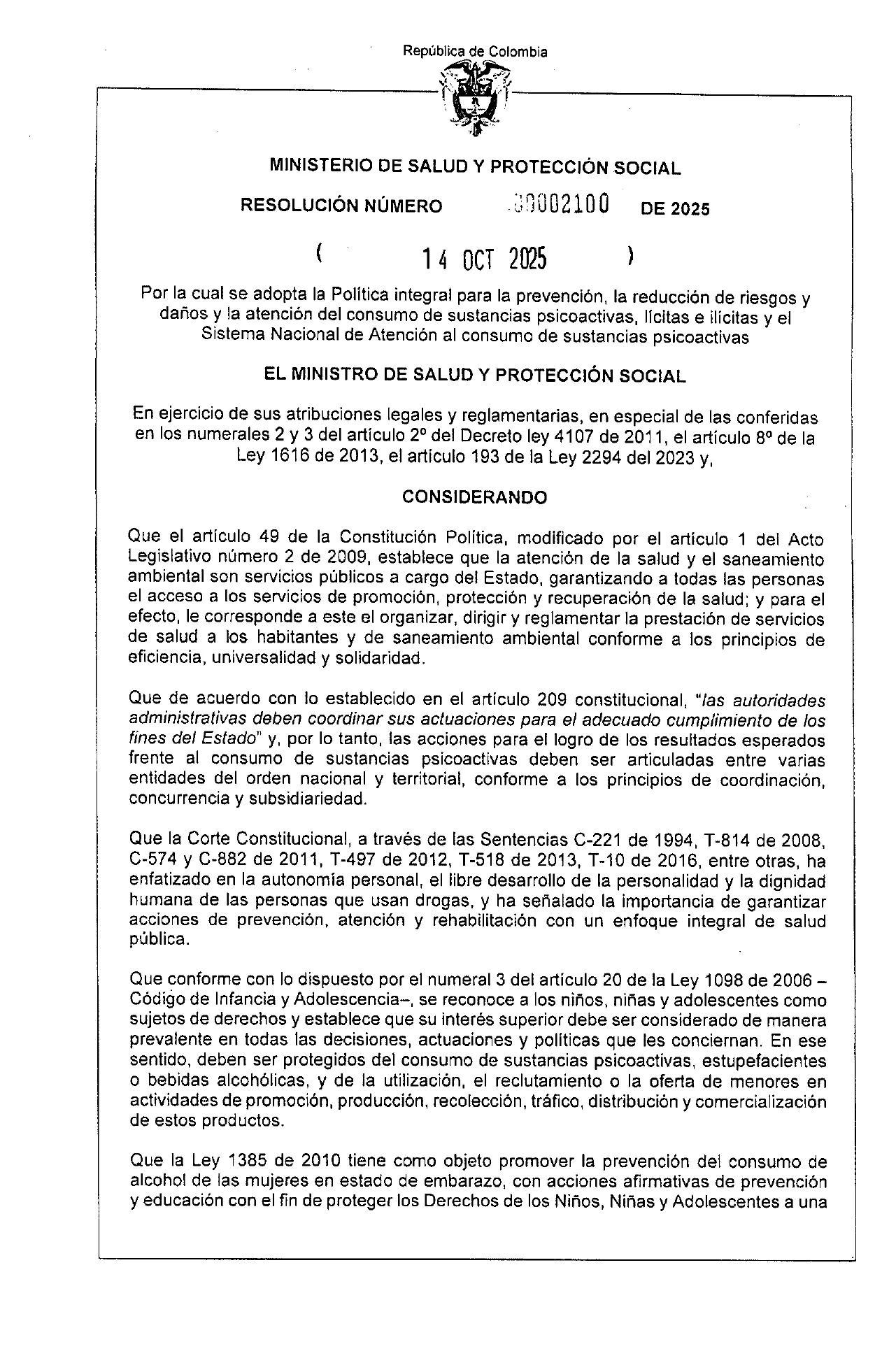 El Ministerio de Salud emitió la Resolución 2100 de 2025, con el objetivo de prevenir y reducir los riesgos asociados al consumo de sustancias psicoactivas, implementando un Sistema Nacional de Atención que integra múltiples sectores.