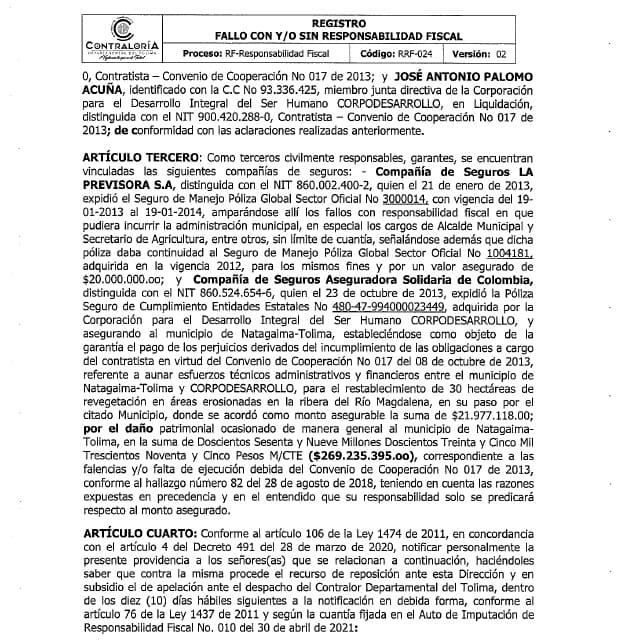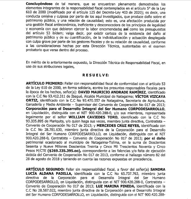 El fallo proferido por la Contraloría Departamental del Tolima da cuenta de falencias y/o falta de ejecución en el convenio de cooperación N° 017 de octubre de 2013 suscrito con la Corporación para el Desarrollo Integral del Ser Humano CORPODESARROLLO cuyo objetivo era el de aunar esfuerzos técnicos, administrativos y financieros para el el restablecimiento de 30 hectáreas de revegetalización en áreas erosionadas en la ribera del río Grande de la Magdalena, en su paso por el municipio de Natagaima, por un valor de $269.235.395.