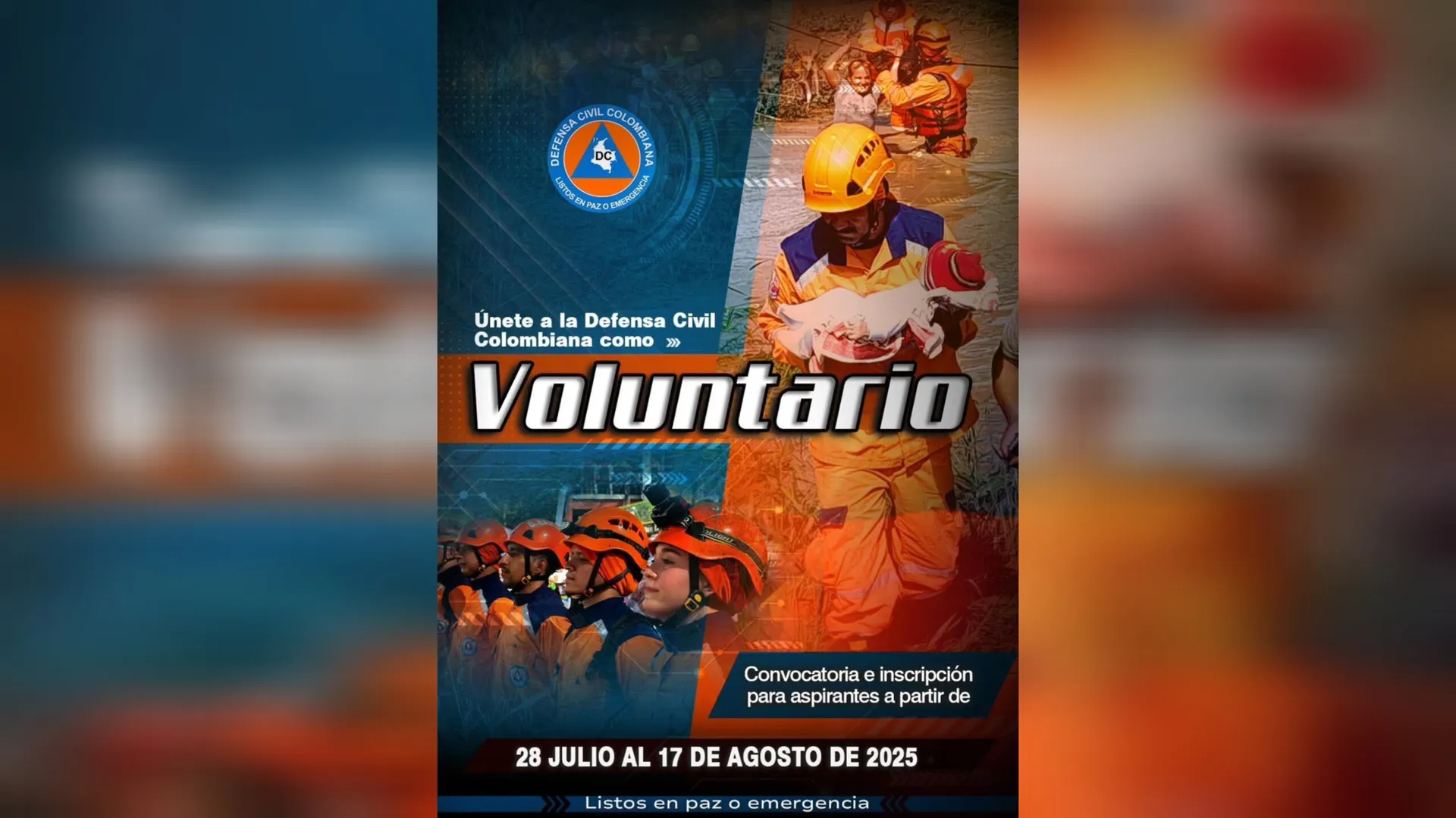 La Defensa Civil Colombiana abrió inscripciones hasta el 17 de agosto para vincular nuevos voluntarios en el Tolima y otras regiones del país. El llamado está dirigido a personas entre 18 y 45 años con vocación de servicio y sin antecedentes judiciales.