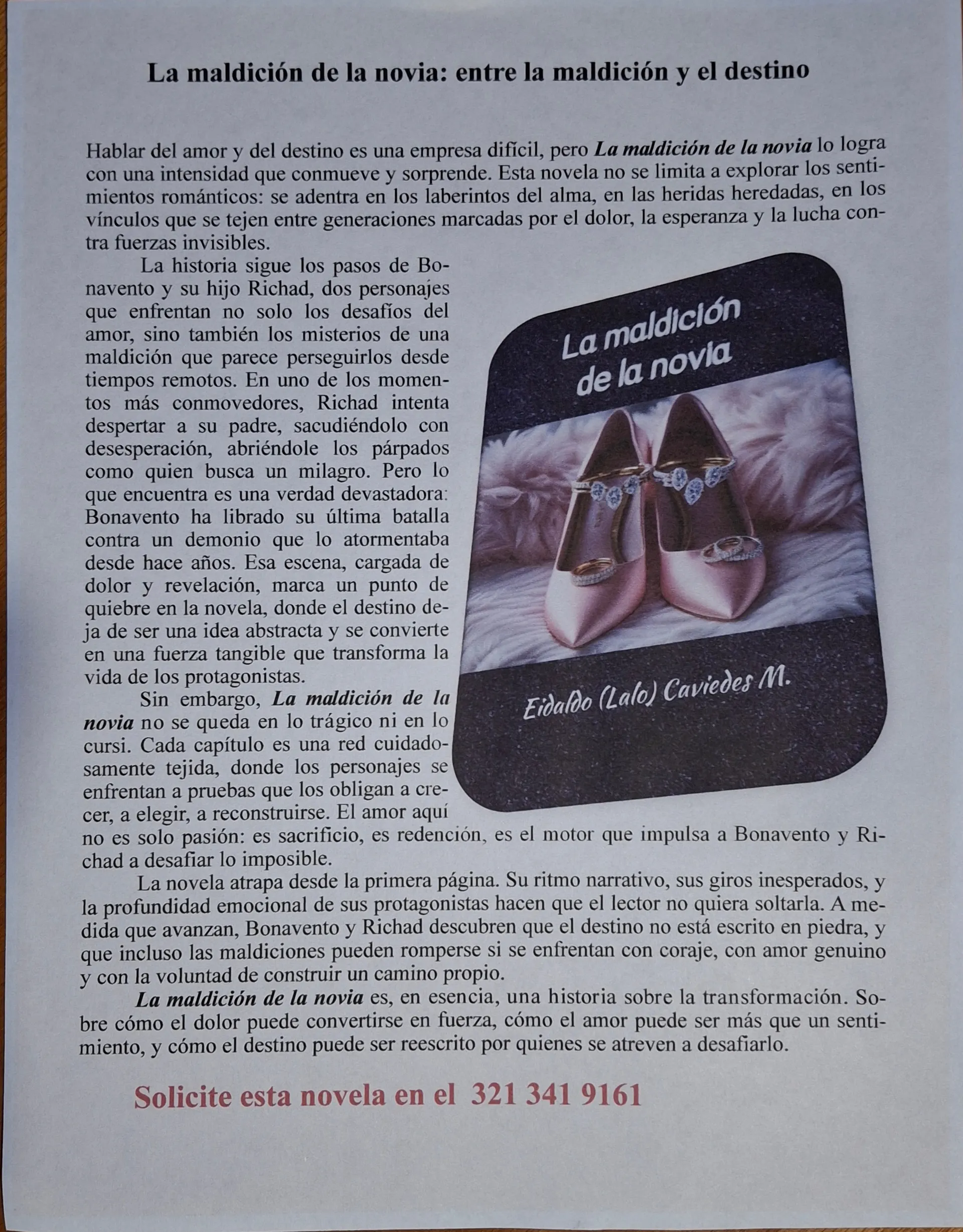 La Feria del Libro del Tolima 2025 cerró sus puertas dejando grandes recuerdos y nuevas historias por contar. Entre los escritores que participaron se destacó Eidaldo Caviedes, oriundo de La Mesa, Cundinamarca, quien presentó oficialmente su más reciente novela titulada La Maldición de la Novia, una obra que atrapó la atención de lectores de todas las edades por su enfoque en los valores humanos y la unión familiar.