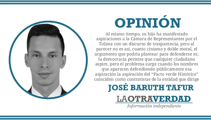 Al mismo tiempo, su hijo ha manifestado aspiraciones a la Cámara de Representantes por el Tolima con un discurso de trasparencia, pero al parecer no es así, cuanto cinismo y doble moral, el argumento que podría plantear para defenderse es; la democracia permite que cualquier ciudadano aspire, pero el problema surge cuando los nombres que aparecen defendiendo públicamente esa aspiración la aspiración del “Pacto verde Histórico” coinciden como contratistas de la entidad que dirige su padre.