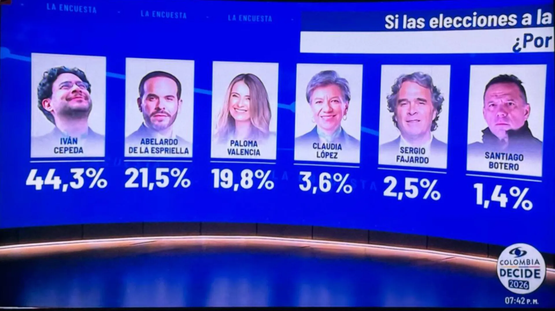 La más reciente encuesta de Invamer para Noticias Caracol y Blu Radio, revelada este 26 de abril de 2026, confirma el sólido liderazgo de Iván Cepeda en la carrera por la Casa de Nariño. Con un 44,3% de intención de voto en primera vuelta, el senador aventaja por más de 20 puntos a su inmediato perseguidor, el abogado Abelardo de la Espriella, quien registra un 21,5%. En tercer lugar se ubica la senadora Paloma Valencia con un 19,8%, evidenciando una competencia concentrada en tres figuras principales. El estudio se realizó a través de 3.800 entrevistas presenciales en 149 municipios, garantizando una cobertura nacional diversa.