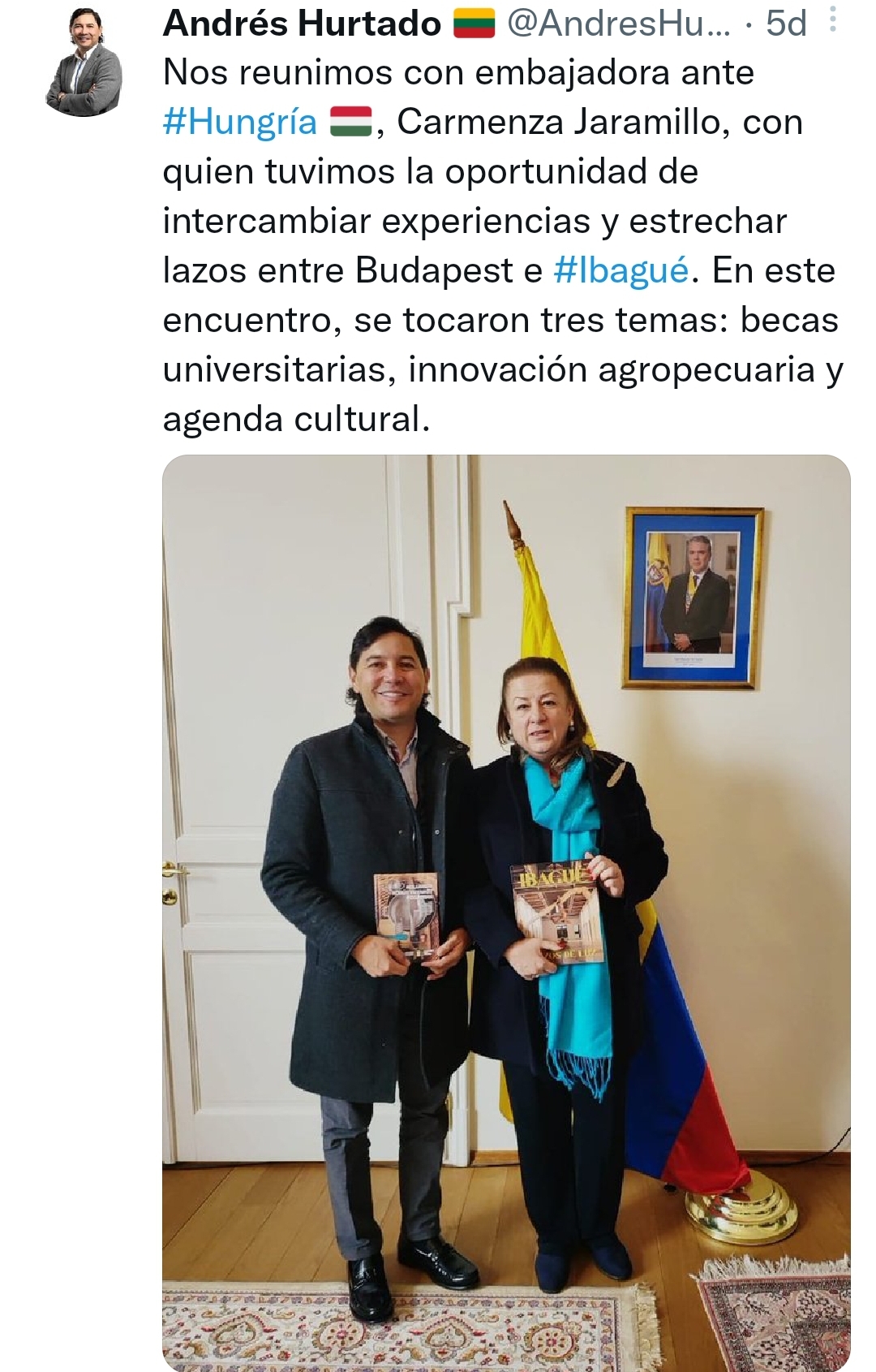 Por fortuna del alcalde Hurtado, puedo instalar una reunión con la embajadora de Colombia en ese país, Carmenza Jaramillo, donde logró tocar tres temas de interés: como becas universitarias, Innovación agropecuaria y agenda cultural”.