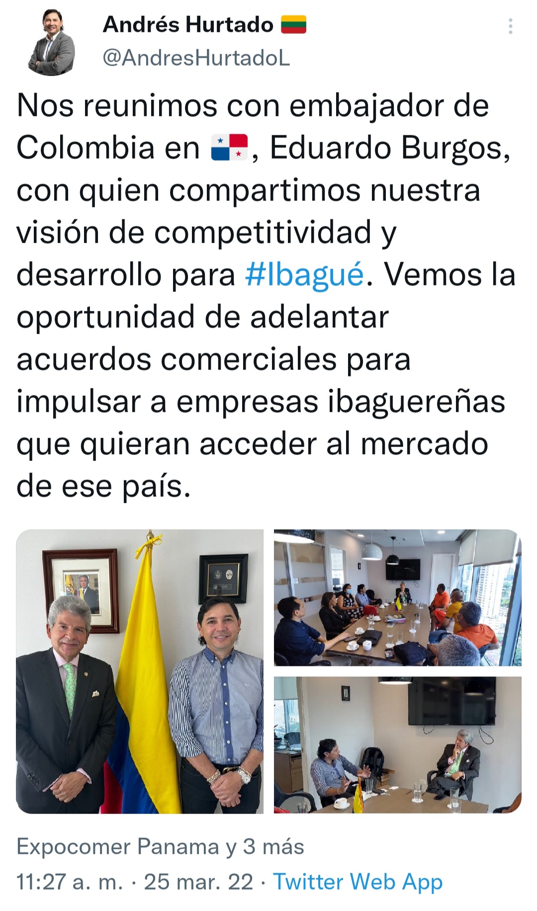 En esa oportunidad mandatario local manifestó, “nos reunimos con el embajador de Colombia en Panamá, con quién compartimos nuestra visión de competitividad y desarrollo para Ibagué. Vemos la oportunidad de adelantar acuerdos comerciales para impulsar a empresas ibaguereña que quieran acceder al mercado de ese país”.