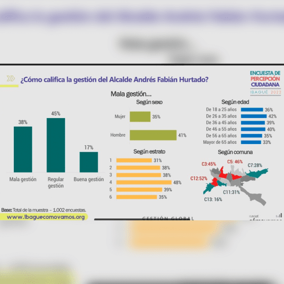 Segun la encuenta de Percepción Ciudadana 2023, el mandatario local Andrés Fabián Hurtado, tiene una imagen desfavorable del 52%, mientras que los resultados de su gestión y manejo de los recursos públicos no son favorables, pues aunque le falta aproximado de diez meses para irse del cargo, su administración ha estado con varios escándalos.