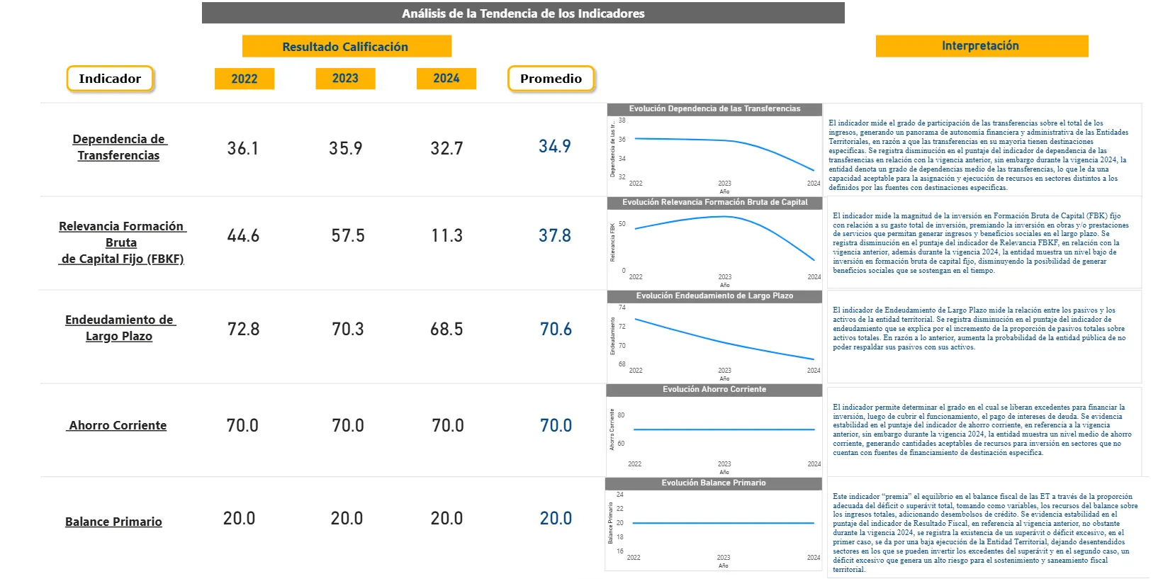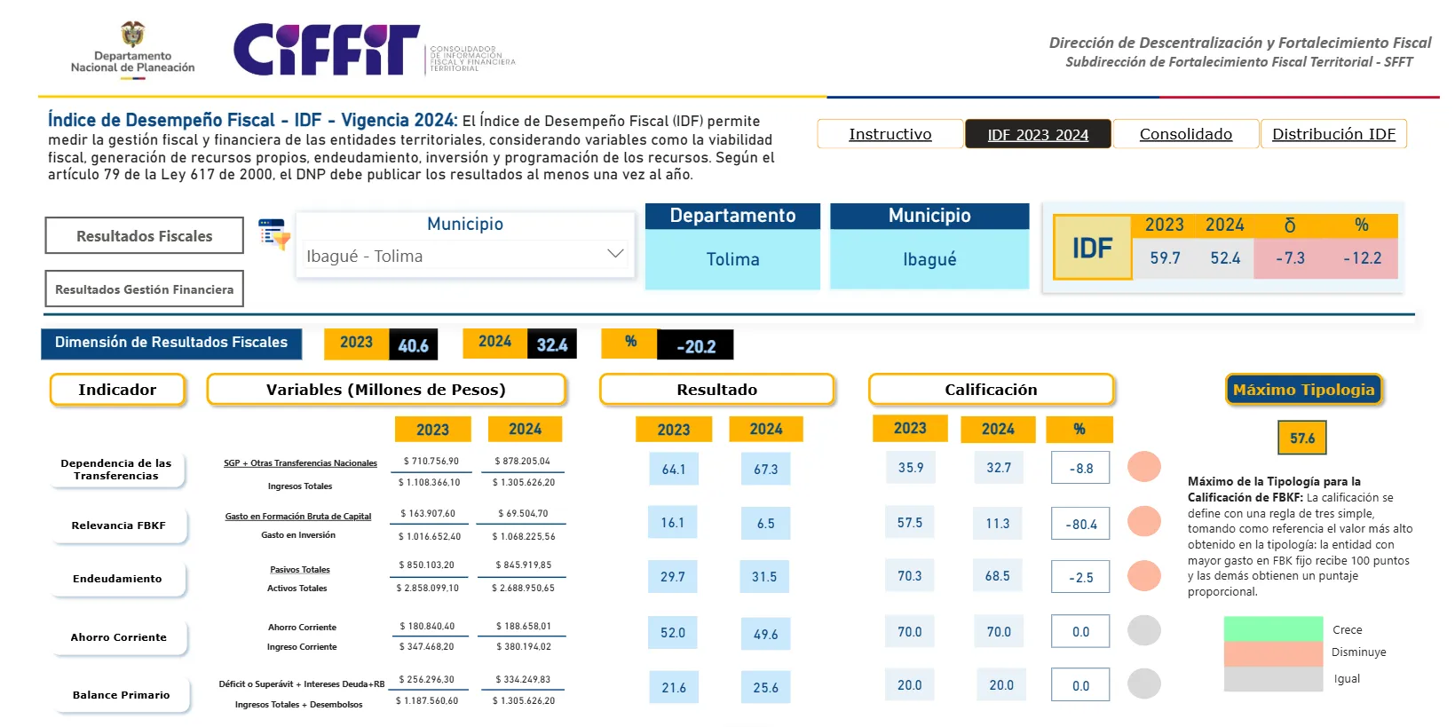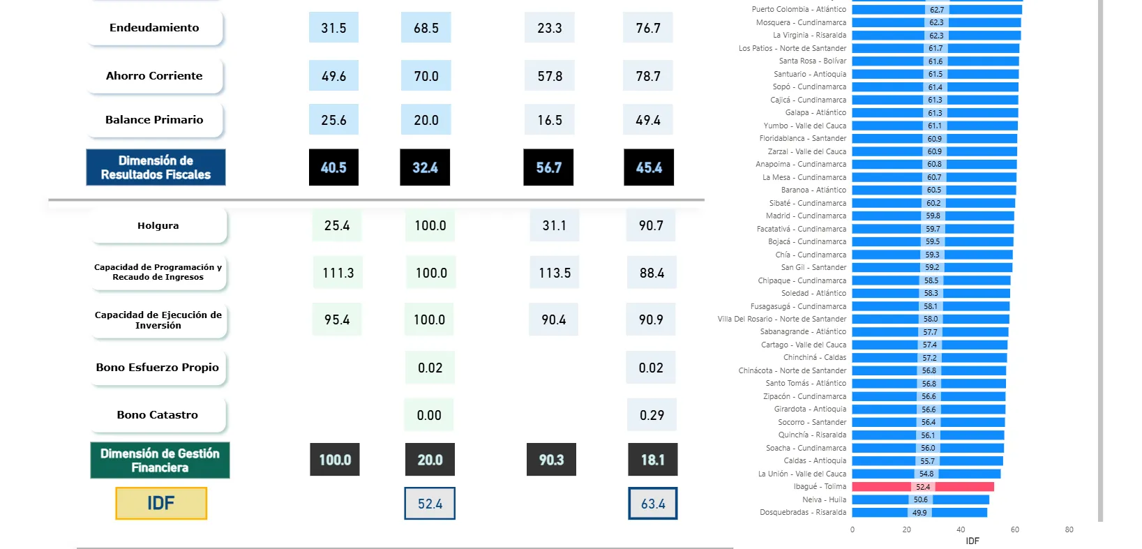 El indicador de desempeño fiscal evalúa la gestión de los gobiernos locales a partir de variables como ingresos propios, endeudamiento, ejecución presupuestal, inversión pública y sostenibilidad financiera. Con un puntaje de 52,42, la capital tolimense fue clasificada en el rango de “riesgo” (entre 40 y 60 puntos), lo que refleja deficiencias en la administración de sus recursos.