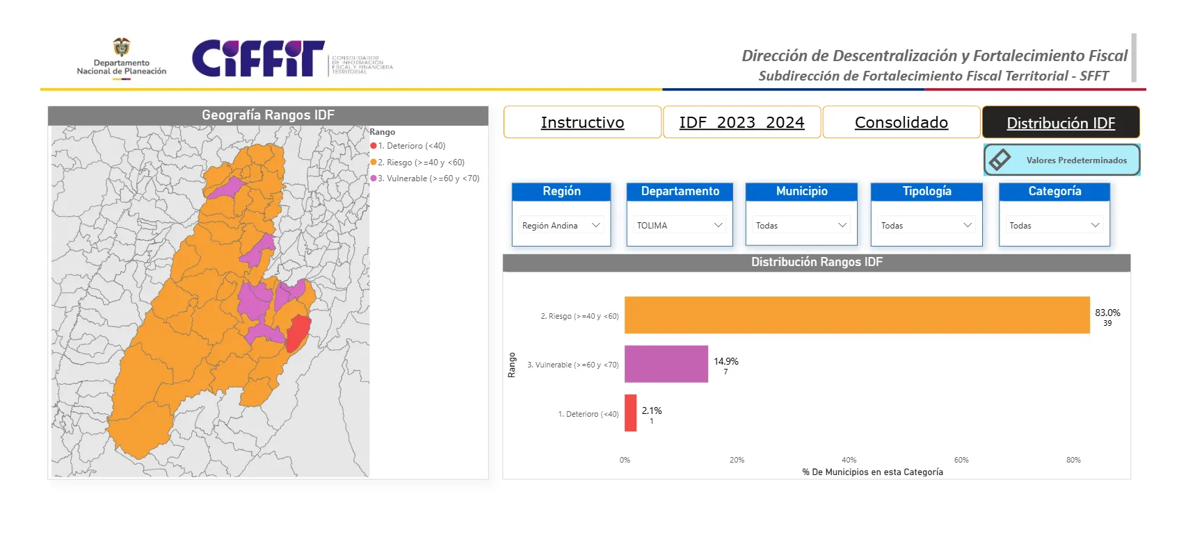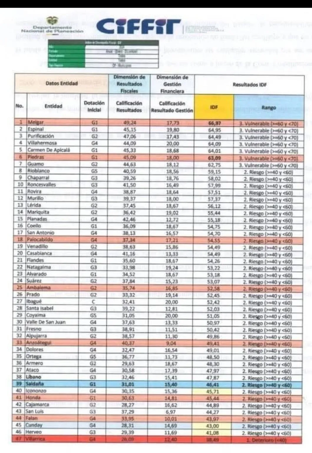 El ranking lo lidera Melgar, con 66,97 puntos, seguido por El Espinal (64,95) y Purificación (64,49), municipios que se destacan por una gestión financiera más eficiente. En contraste, Villarrica ocupa el último lugar del departamento, con un preocupante puntaje de 38,43 que la ubica en el rango de deterioro fiscal.