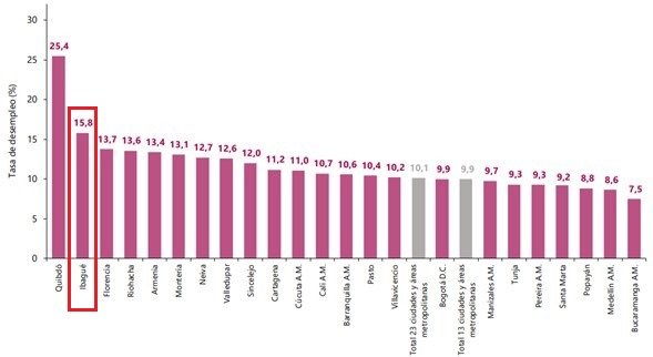 La ciudad de Ibagué, capital del departamento de Tolima, continúa enfrentando un desafío económico significativo, ya que según los últimos datos revelados por el Departamento Administrativo Nacional de Estadística (DANE), para el trimestre que abarca de mayo a julio de 2023, se encuentra en el segundo lugar en términos de la tasa de desempleo más alta en Colombia, alcanzando un alarmante 15,8%.
