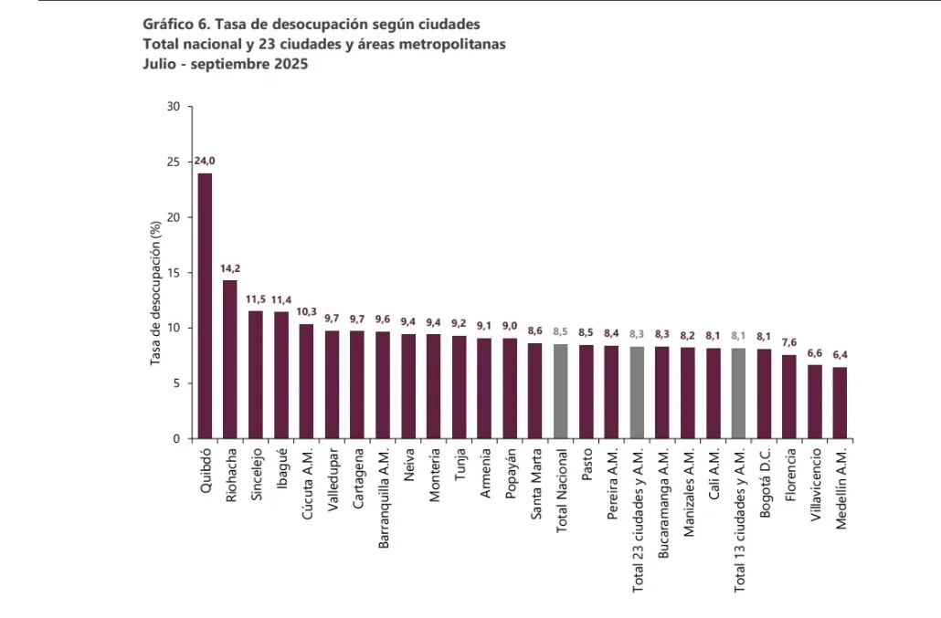 El reporte muestra que Ibagué se ubica en el cuarto lugar nacional en desempleo, después de Quibdó (24 %), Riohacha (14,2 %) y Sincelejo (11,5 %). En contraste, las ciudades con menores niveles de desocupación fueron Medellín (6,4 %), Villavicencio (6,6 %) y Florencia (7,6 %), lo que refleja la persistencia de brechas regionales en la dinámica laboral.