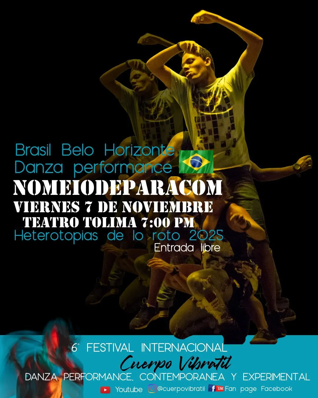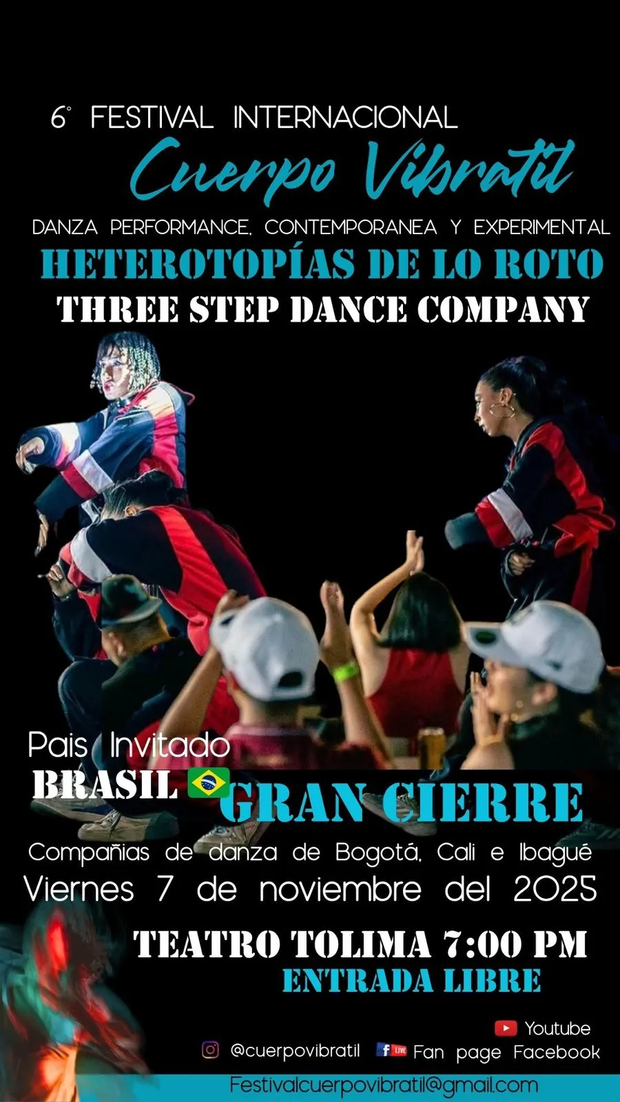 El gran cierre tendrá lugar el 7 de noviembre a las 7:00 p.m. en el Teatro Tolima, con entrada totalmente libre para el público. En esta jornada se presentarán seis obras provenientes de Brasil, México, Cali, Bogotá, La Dorada (Caldas) e Ibagué, en una noche que promete convertirse en un manifiesto vivo del movimiento contemporáneo. Cada pieza será testimonio de resistencia, fuerza y creación, haciendo del escenario un territorio donde el arte se expresa desde la potencia del cuerpo y la sensibilidad colectiva.