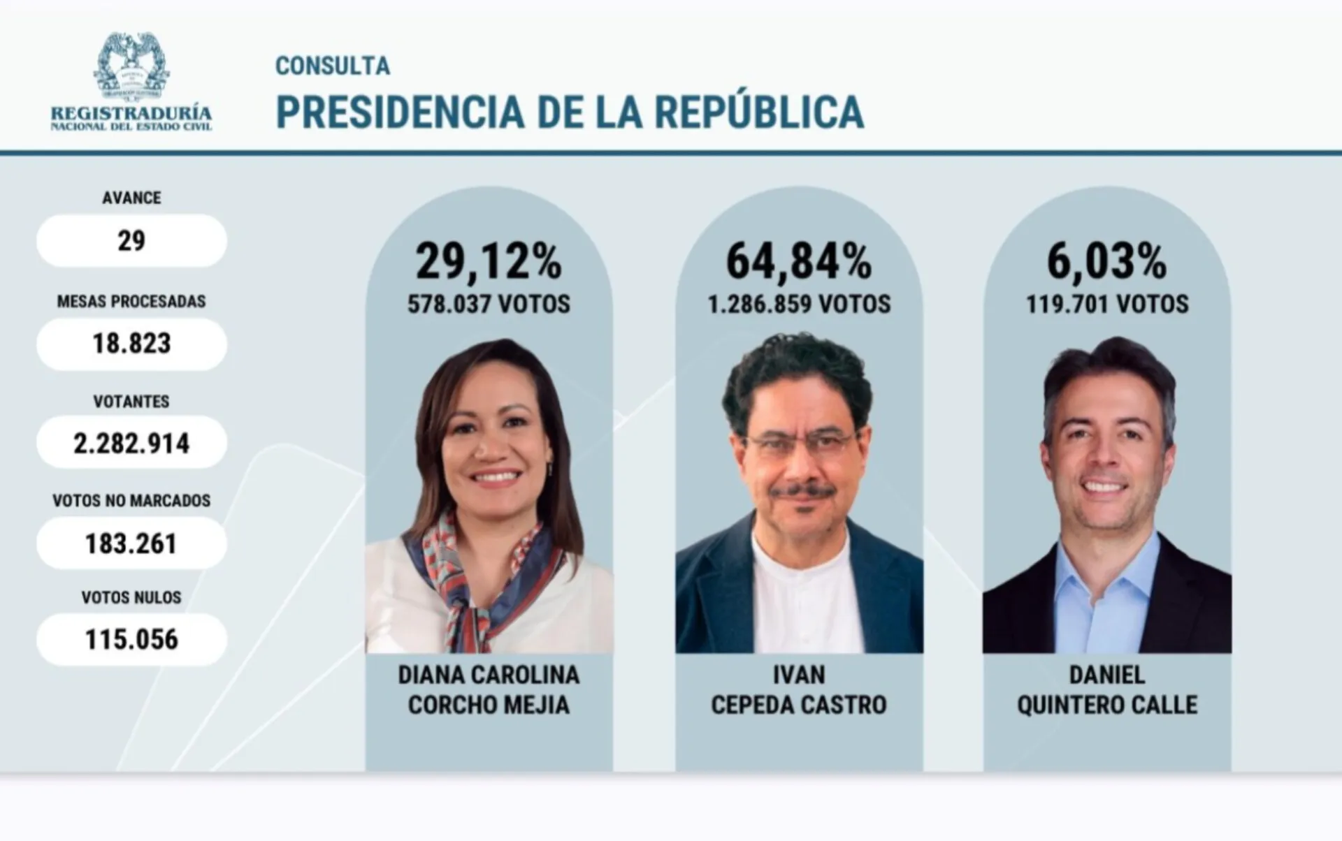 El senador Iván Cepeda Castro fue elegido como candidato presidencial del Pacto Histórico para las elecciones de 2026, tras obtener una contundente victoria en la consulta interna de la coalición con el 64,84 % de los votos, según el más reciente boletín de la Registraduría Nacional del Estado Civil. Cepeda superó ampliamente a la exministra Carolina Corcho y al exalcalde Daniel Quintero, quien había declinado su participación días antes del proceso.