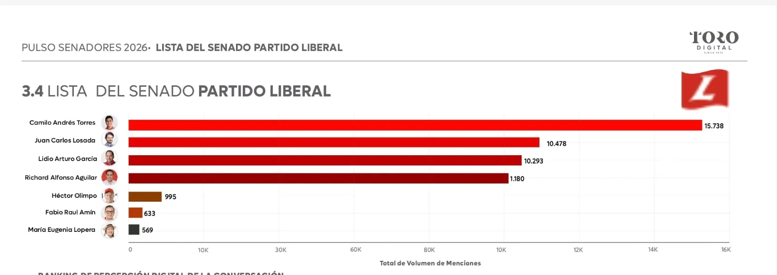 De acuerdo con la gráfica del informe “Pulso Senadores 2026”, Losada alcanzó 10.478 menciones en plataformas digitales, ubicándose en el segundo lugar del escalafón liberal, solo por detrás de Camilo Andrés Torres, quien registró 15.738 menciones, y por encima de otros aspirantes como Lidio Arturo García, con 10.293.