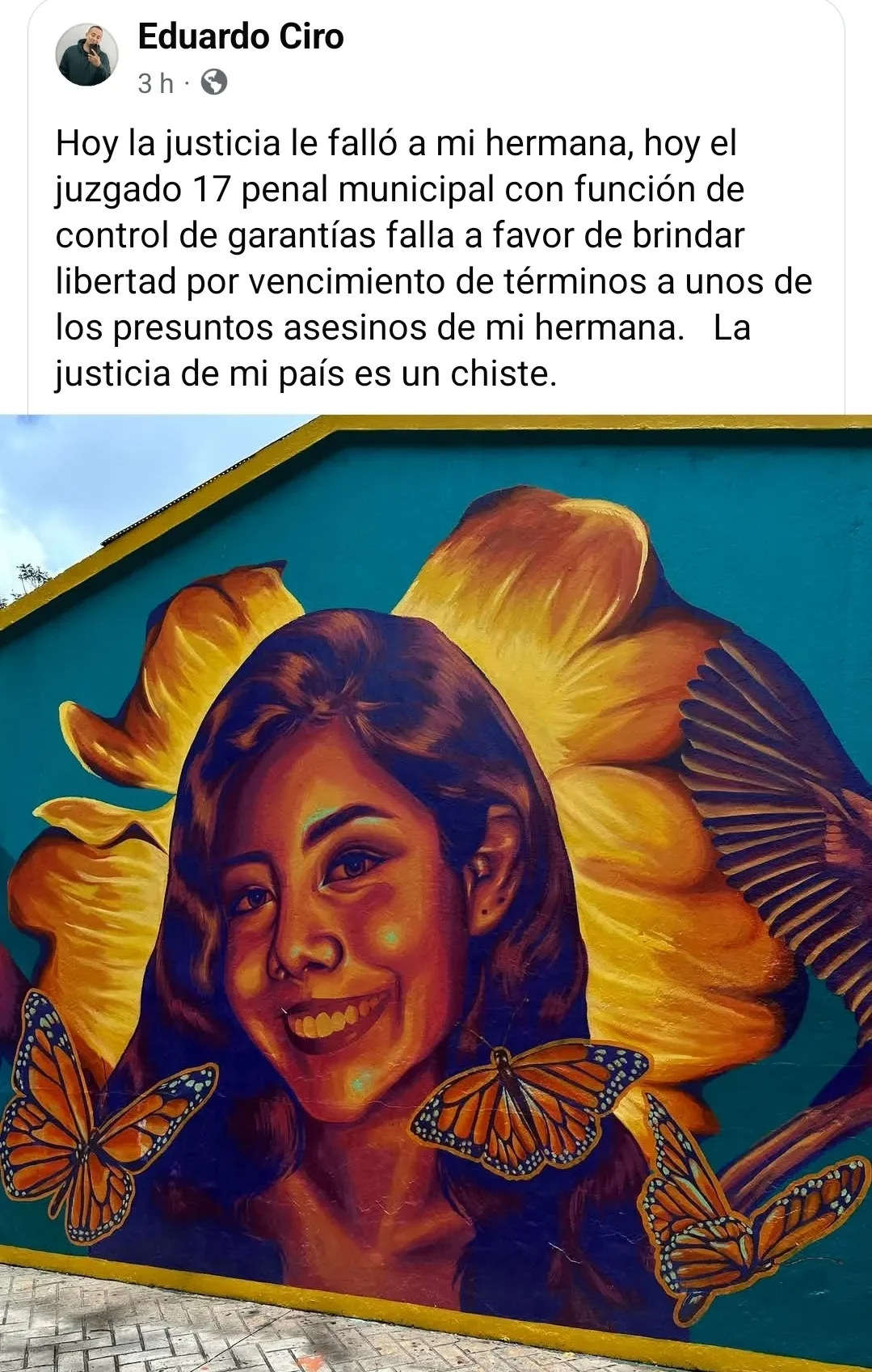 La noticia ha desatado una ola de impotencia y rabia entre los allegados de la víctima y la sociedad civil. Eduardo Ciro, hermano de Sharit, expresó su dolor e indignación a través de redes sociales, afirmando: “Hoy la justicia le falló a mi hermana, hoy el juzgado 17 penal municipal con función de control de garantías falla a favor de brindar libertad por vencimiento de términos a unos de los presuntos asesinos de mi hermana. La justicia de mi país es un chiste”.