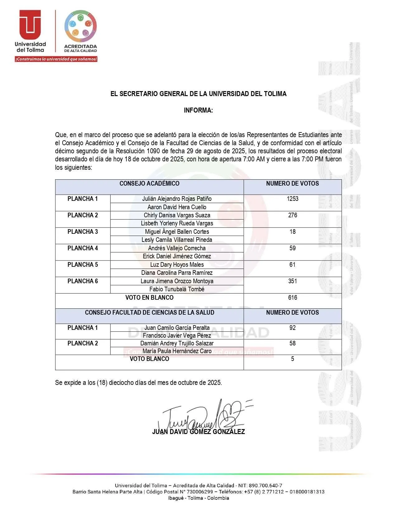 El proceso electoral, supervisado por la Secretaría General de la Universidad del Tolima, se desarrolló con normalidad y alta participación, reafirmando el compromiso institucional con la democracia universitaria. Según el acta oficial firmada por el secretario general Juan David Gómez González, los resultados fueron consolidados y publicados el mismo día, asegurando la transparencia del escrutinio.