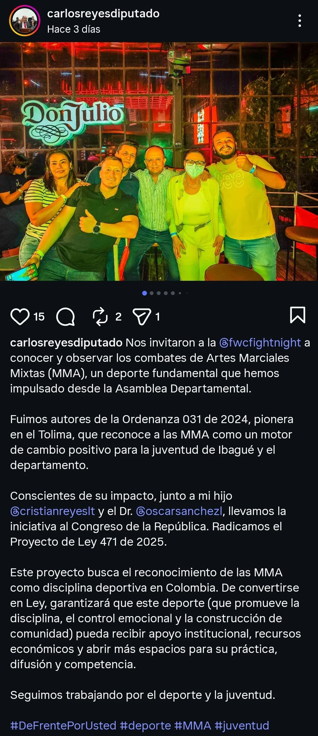 Este compromiso se materializó previamente en la Ordenanza 031 de 2024, una norma pionera en el Tolima que ya reconoce a las MMA como un motor de desarrollo positivo para la juventud de Ibagué y el departamento. La ordenanza sirvió como plataforma y prueba del impacto positivo que el reconocimiento de este deporte puede tener en la vida de los jóvenes tolimenses, llevándolo ahora al ámbito nacional.