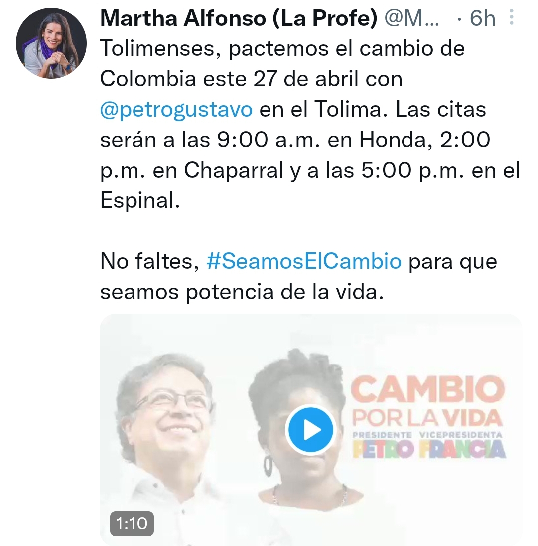 Por su parte la electa Representante a la Cámara Martha Alfonso, extendió la invitación a todos los tolimenses aquí participen y asistan a estas reuniones con el candidato presidencial Gustavo Petro, quien busca en primera instancia ganar en primera vuelta a los demás candidatos que también quieren llegar a la casa de nariño.