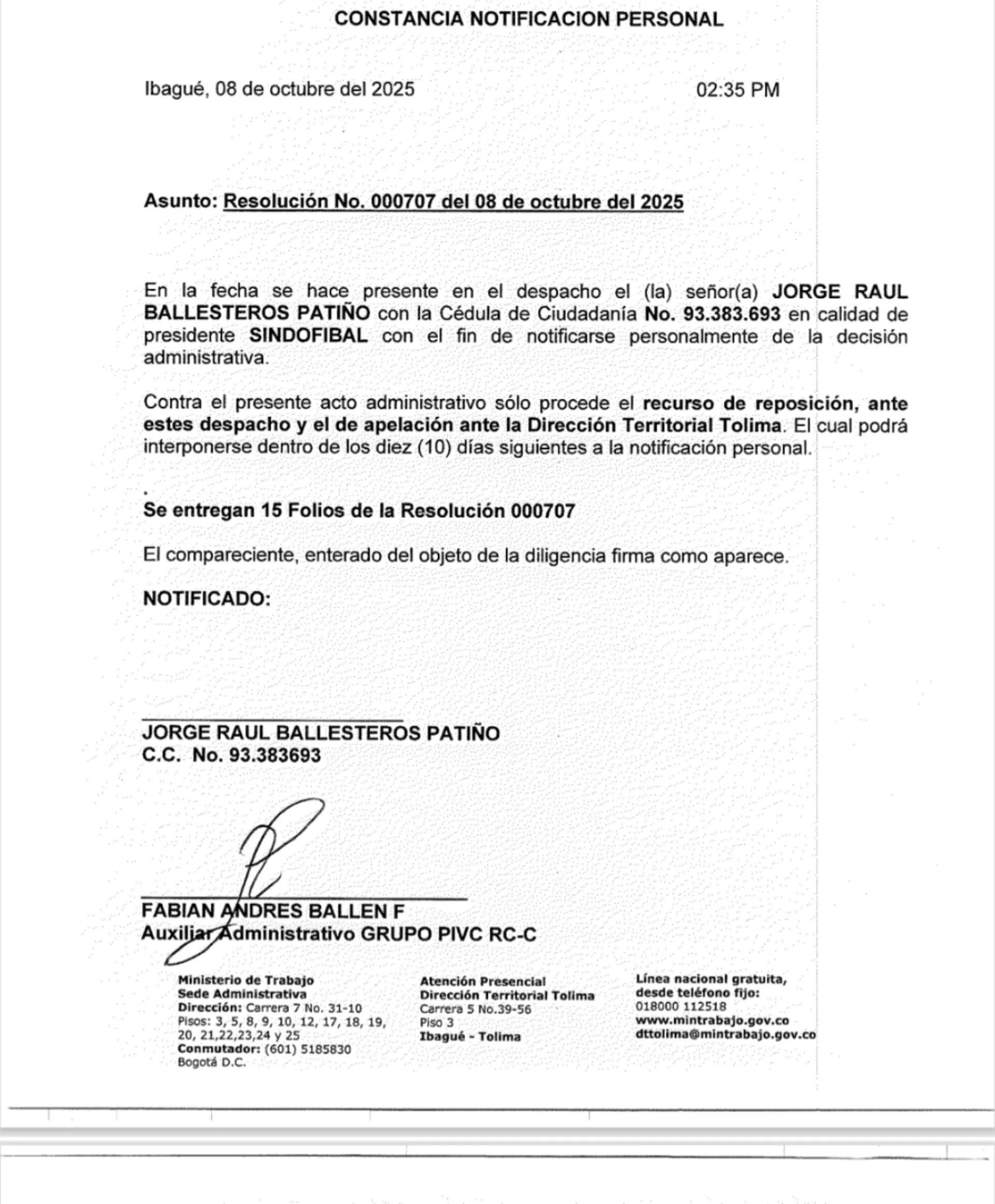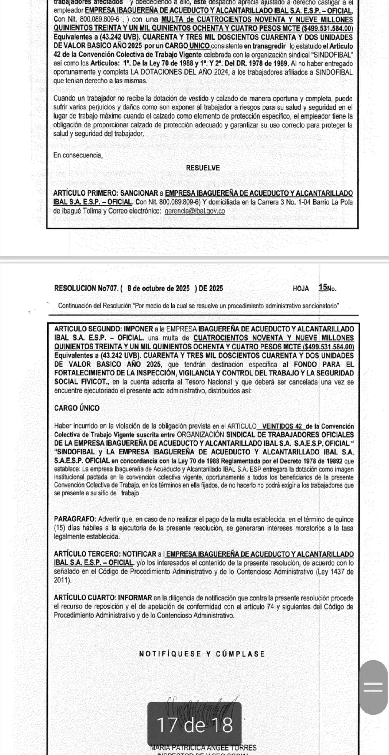 El Ministerio del Trabajo impuso una sanción económica de $499.531.584 a la Empresa Ibaguereña de Acueducto y Alcantarillado (IBAL S.A. E.S.P.), luego de comprobar que la entidad incumplió con la entrega oportuna y completa de la dotación de vestuario y calzado a sus trabajadores oficiales. La medida fue emitida mediante la Resolución No. 707 del 8 de octubre de 2025 y notificada oficialmente a la empresa en Ibagué.