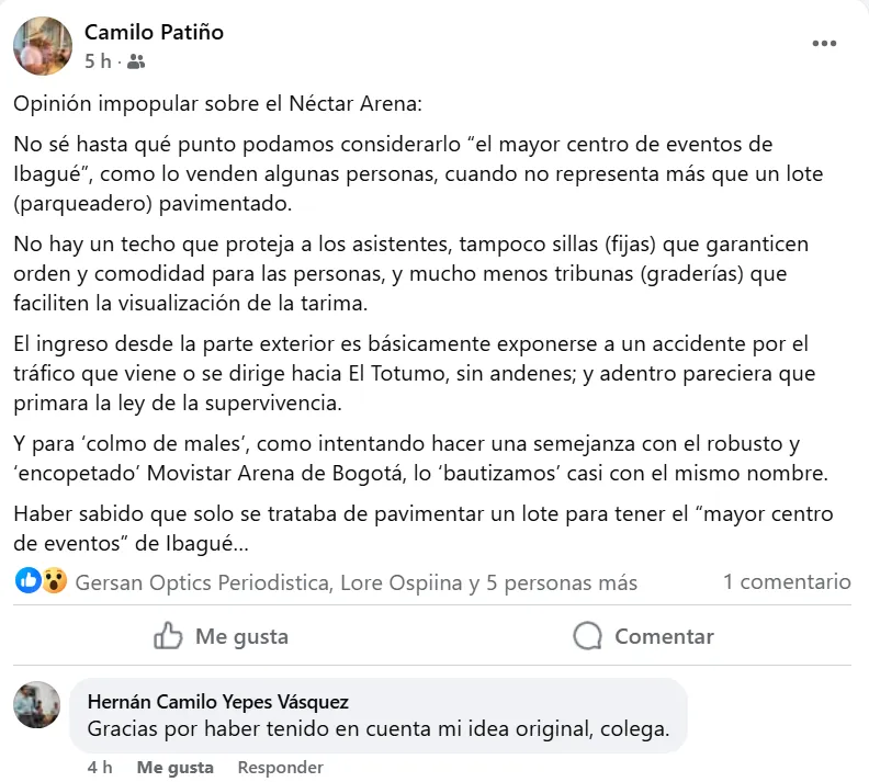 Las opiniones del periodista generaron una amplia discusión en plataformas digitales. Mientras unos internautas coinciden en que el recinto es una improvisación que carece de planeación urbana, otros defienden que, aunque aún es limitado, ofrece un espacio que antes no existía para recibir artistas de gran convocatoria. El contraste refleja la falta de consenso sobre el rumbo cultural y de entretenimiento que debería tomar Ibagué.