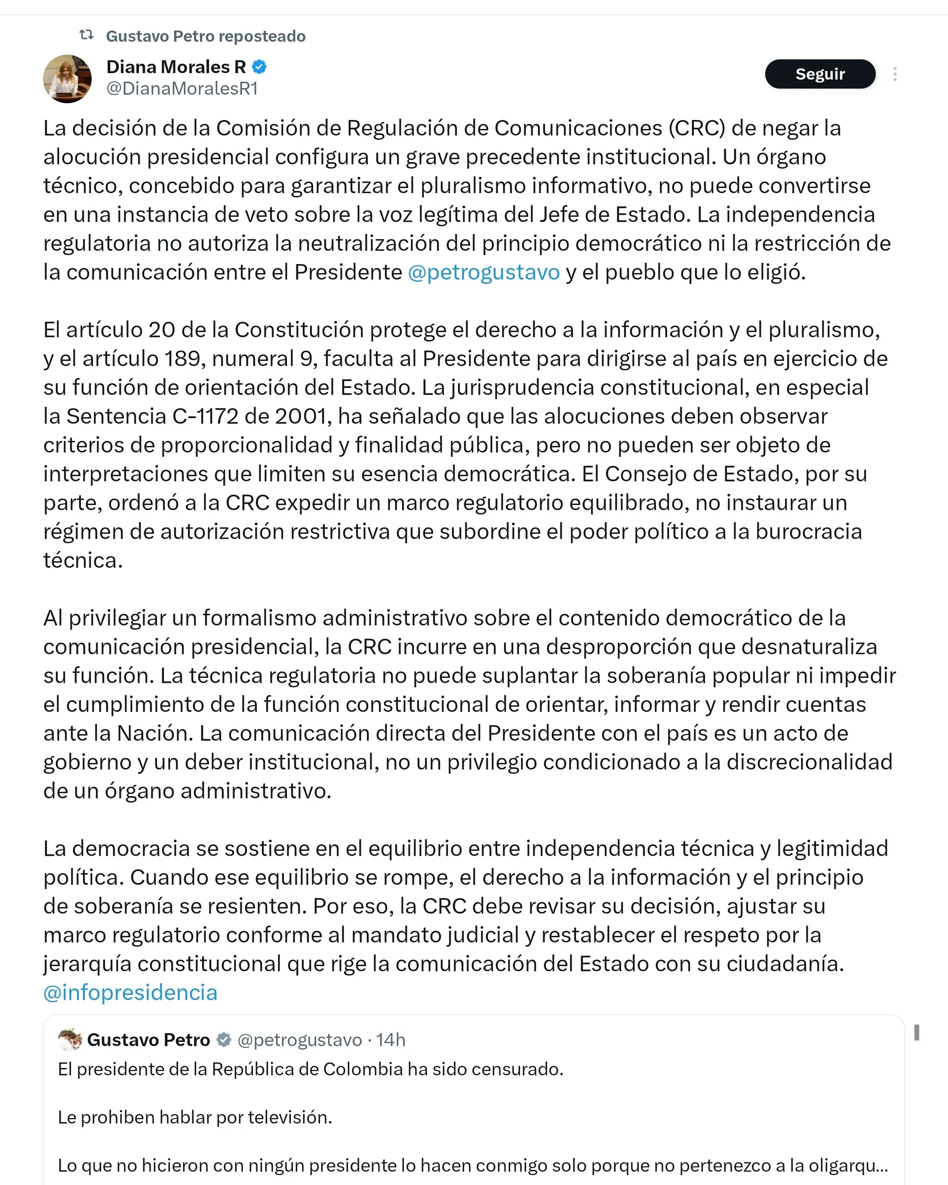 Finalmente, el presidente trajo a colación al filósofo alemán Jürgen Habermas para advertir sobre los riesgos de limitar el debate público y la comunicación social. “La violencia no es más que la ausencia de comunicación social”, citó, sugiriendo que la restricción a la discusión pública solo amplía el espacio para la violencia. La CRC, por su parte, había argumentado que la solicitud no cumplía con los criterios de urgencia requeridos.