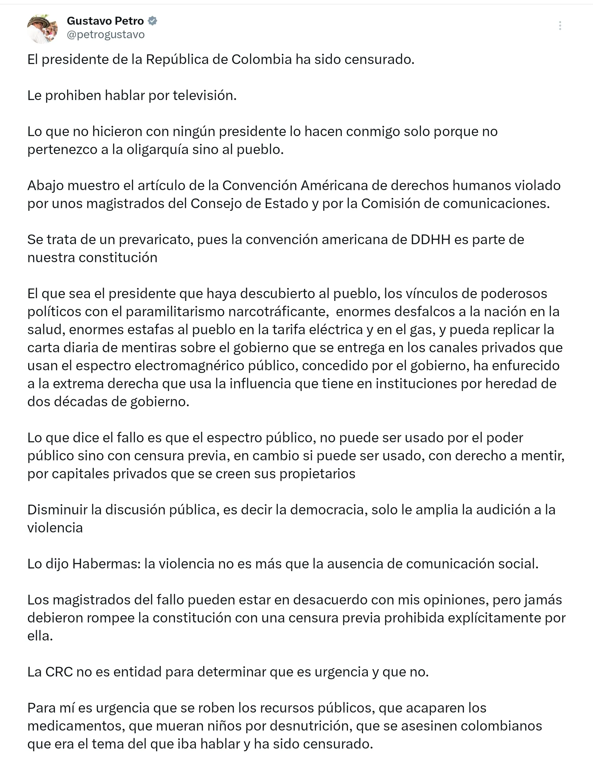 Petro también aprovechó para criticar lo que considera un trato desigual en el uso del espectro electromagnético público. Indicó que, según el fallo, “el espectro público no puede ser usado por el poder público sino con censura previa, en cambio sí puede ser usado, con derecho a mentir, por capitales privados que se creen sus propietarios”, resaltando la paradoja democrática.