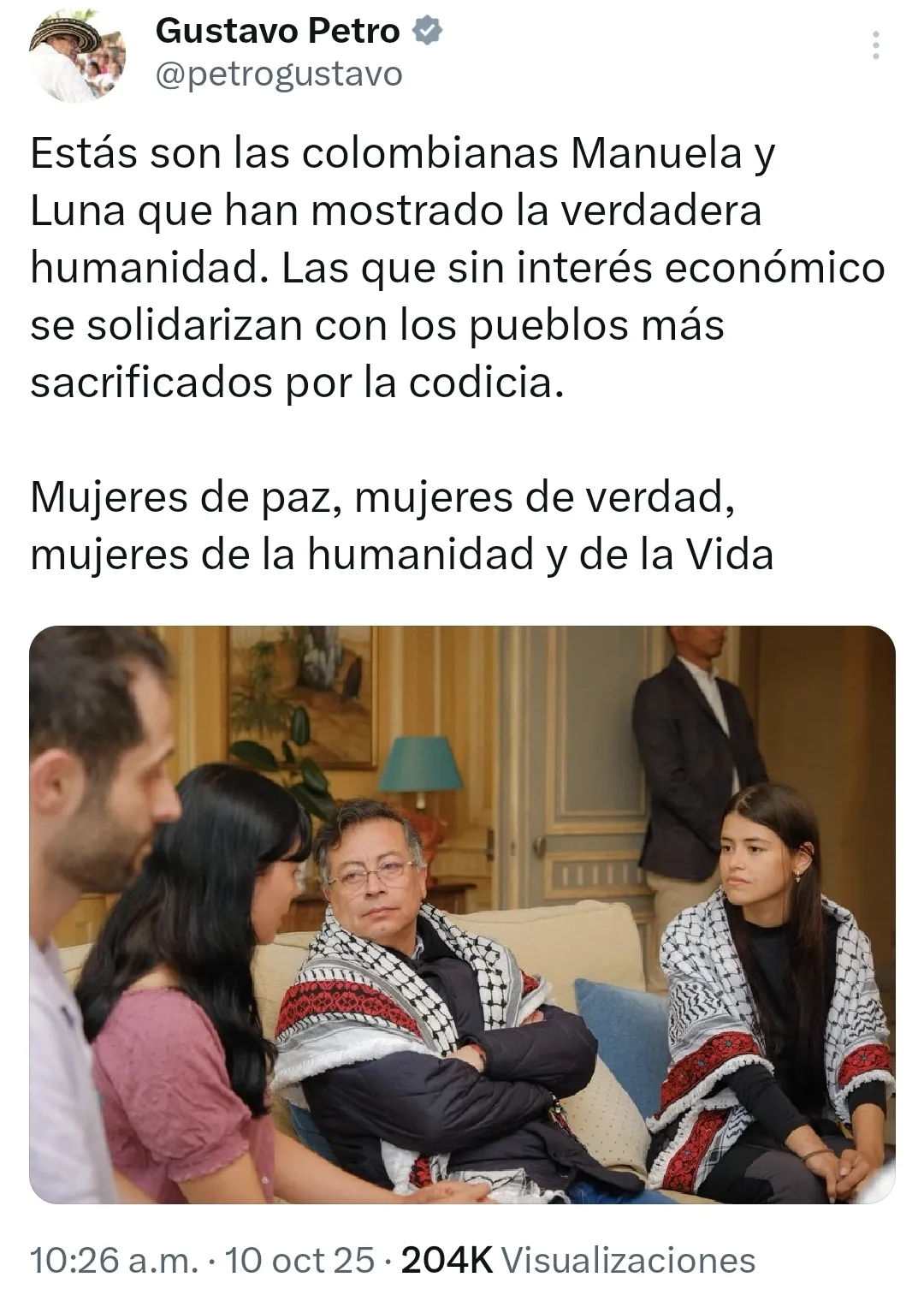 “Estas son las colombianas Manuela y Luna que han mostrado la verdadera humanidad. Las que sin interés económico se solidarizan con los pueblos más sacrificados por la codicia”, escribió Petro en su cuenta de X, agregando: “Mujeres de paz, mujeres de la humanidad y de la vida.”