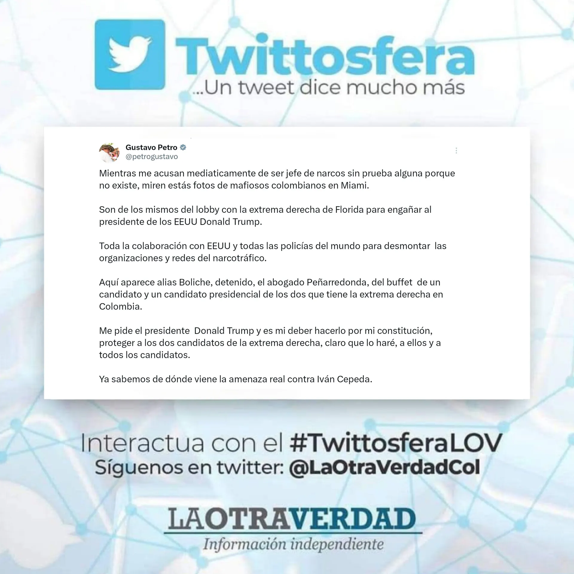 El mandatario colombiano arremetió contra la «extrema derecha» tras la difusión de imágenes que relacionan a un candidato presidencial con figuras del narcotráfico en Florida.