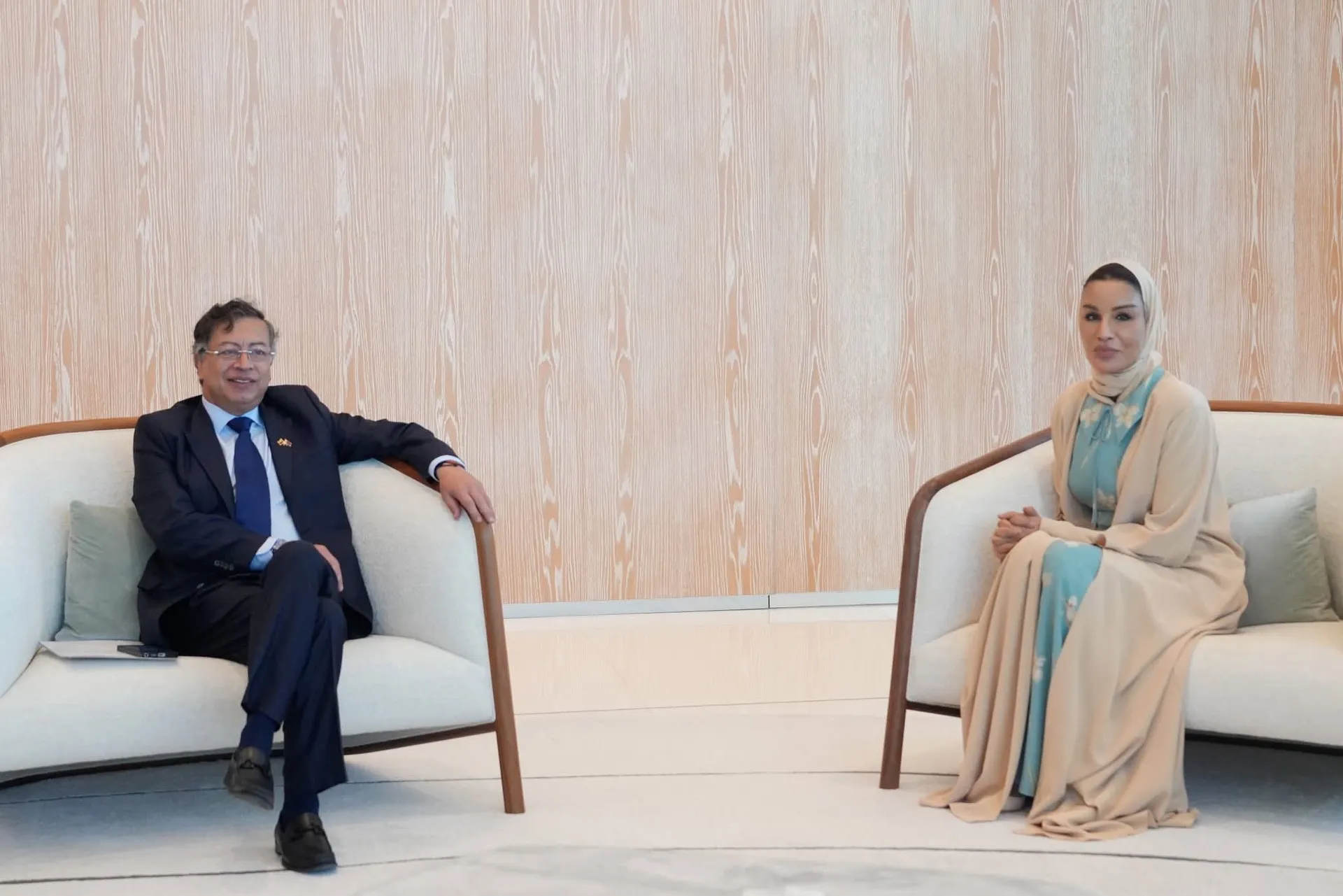 En el marco de la agenda oficial del presidente Gustavo Petro en Doha, Catar, el mandatario colombiano sostuvo un encuentro con la jequesa Moza bint Nasser, reconocida impulsora del derecho a la educación a nivel mundial. Durante el diálogo, la jequesa agradeció expresamente la posición de Colombia frente al conflicto en Palestina y resaltó el reciente discurso del presidente en la Naciones Unidas, en el que el país reafirmó su compromiso con los derechos humanos.