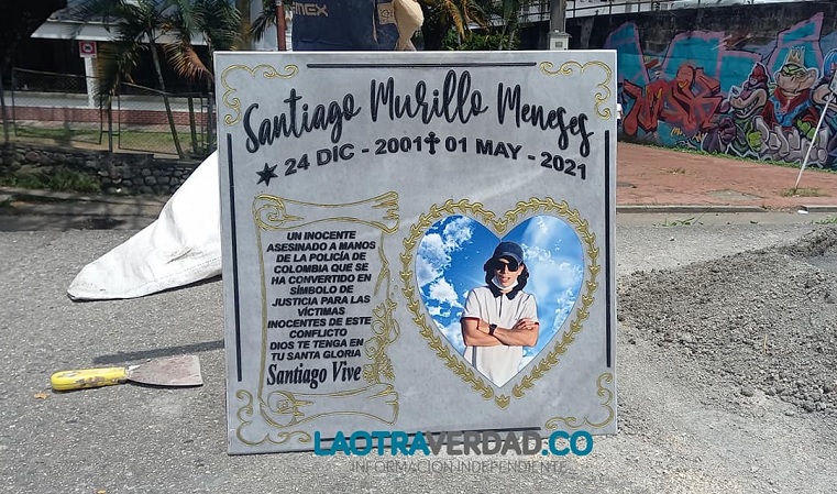 El joven Santiago Murillo Meneses de 19 años de edad que fue víctima de una bala accionada por Jorge Mario Molano el pasado primero de mayo del 2021, ahora tiene placa conmemorativa organizada por diferentes colectivos y activistas de la ciudad musical quienes la instalaron en el punto donde originalmente fue herido de muerte Santiago.