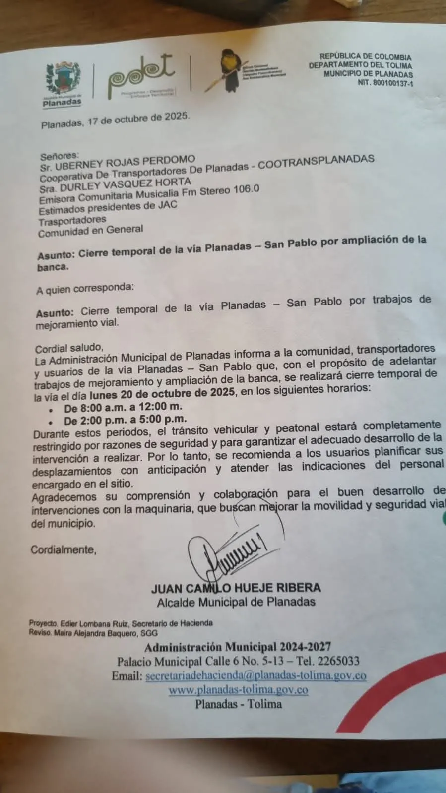 La Administración Municipal de Planadas, bajo el liderazgo del alcalde Juan Camilo Hueje Ribera, anunció que este lunes 20 de octubre se llevará a cabo el cierre temporal de la vía Planadas – San Pablo, debido a los trabajos de mejoramiento y ampliación de la banca vial, con el objetivo de fortalecer la movilidad y seguridad en este importante corredor rural.