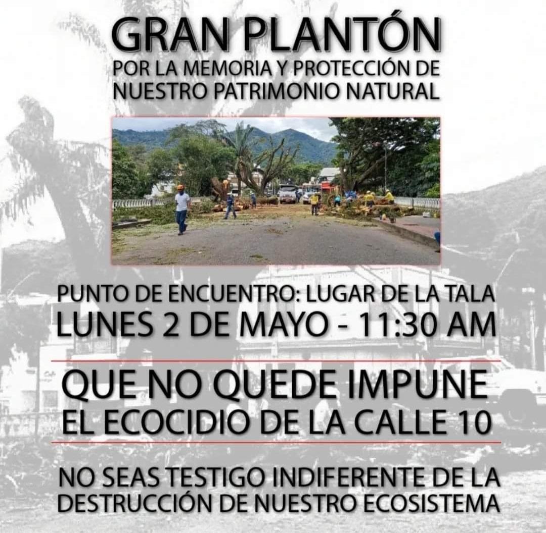 La actividad se programó para este lunes 2 de mayo a las 11:00 a.m. dónde se desarrollaría un plantón que tiene como finalidad rechazar tajantemente la tala de los árboles sobre el sector del Parque Centenario.