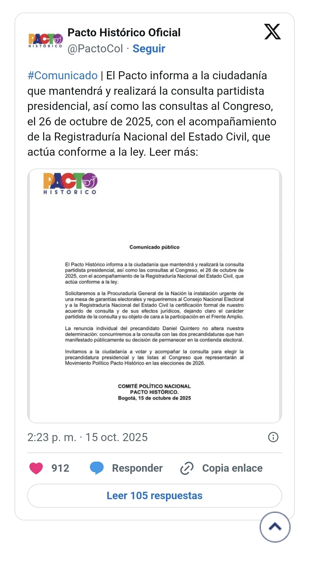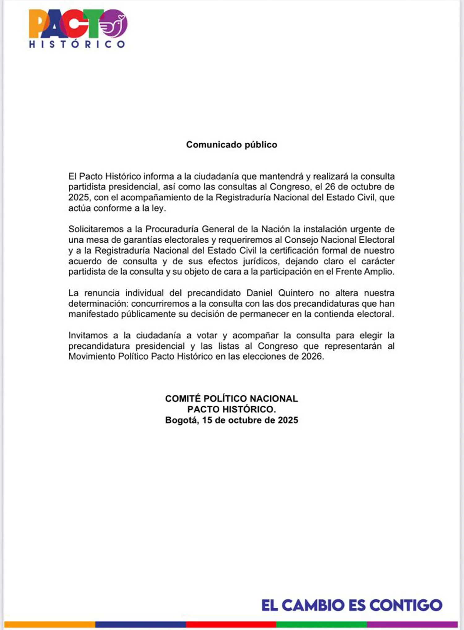 Bogotá, 15 de octubre de 2025. El movimiento político Pacto Histórico confirmó hoy la realización de su consulta interna, tanto presidencial como para conformar las listas al Congreso, que se llevará a cabo el domingo 26 de octubre de 2025. La decisión fue anunciada a través de un comunicado oficial emitido por el Comité Político Nacional, el cual ratificó que el proceso contará con el debido acompañamiento de la Registraduría Nacional del Estado Civil, actuando en el marco de la legalidad vigente.