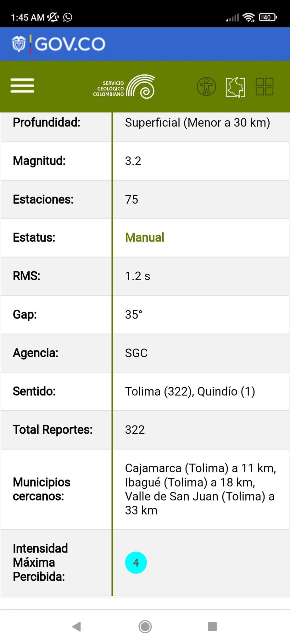 Con una profundidad a 30 kilómetros el movimiento fue registrado por el Servicio Geológico con un grado de magnitud 3.2, en la ciudad de Ibagué.