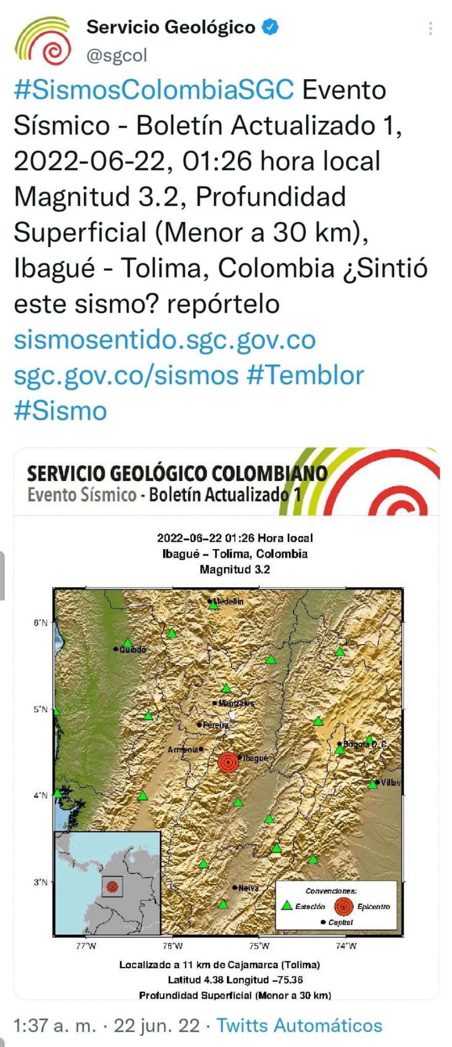 A la 1:26 de la madrugada de este miércoles 22 se junio se registró el momento sísmico por parte del Servicio Geológico colombiano.