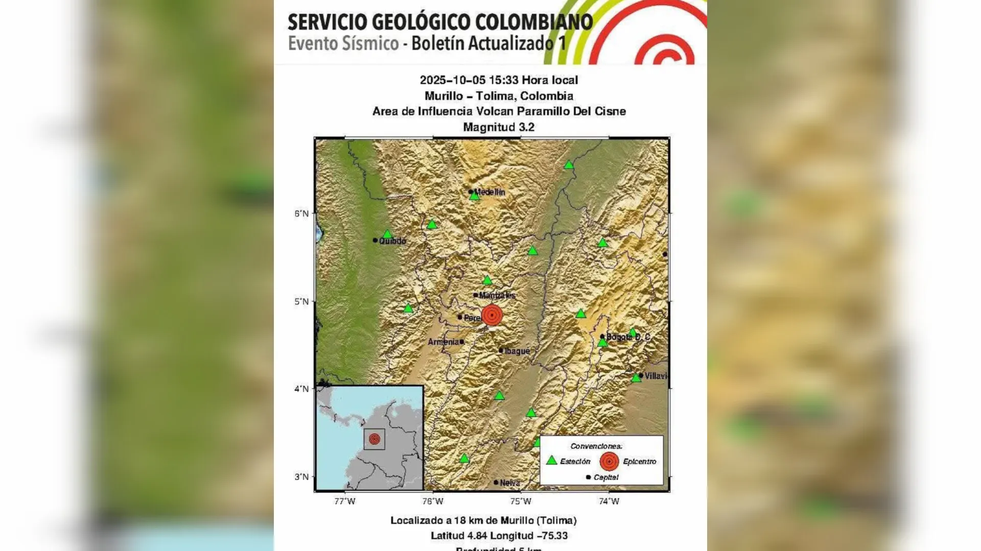 Este domingo 5 de octubre, a las 3:33 p. m., un sismo de magnitud 3,2 se registró en el norte del Tolima, con epicentro ubicado en el área de influencia del volcán Paramillo del Cisne, a 18 kilómetros del municipio de Murillo, informó el Servicio Geológico Colombiano (SGC).