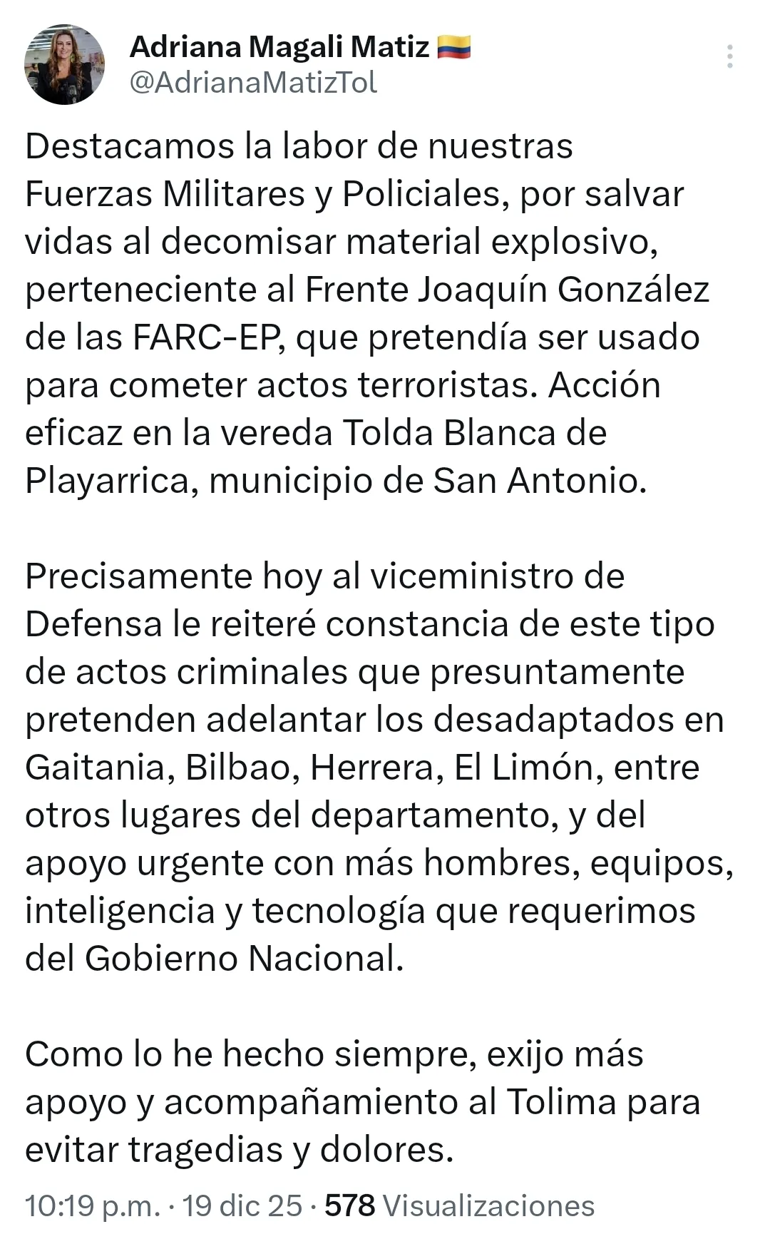 La mandataria regional del Tolima resaltó la incautación de explosivos de las FARC en San Antonio y solicitó al Gobierno Nacional mayor despliegue de hombres, inteligencia y tecnología para proteger puntos críticos del departamento.