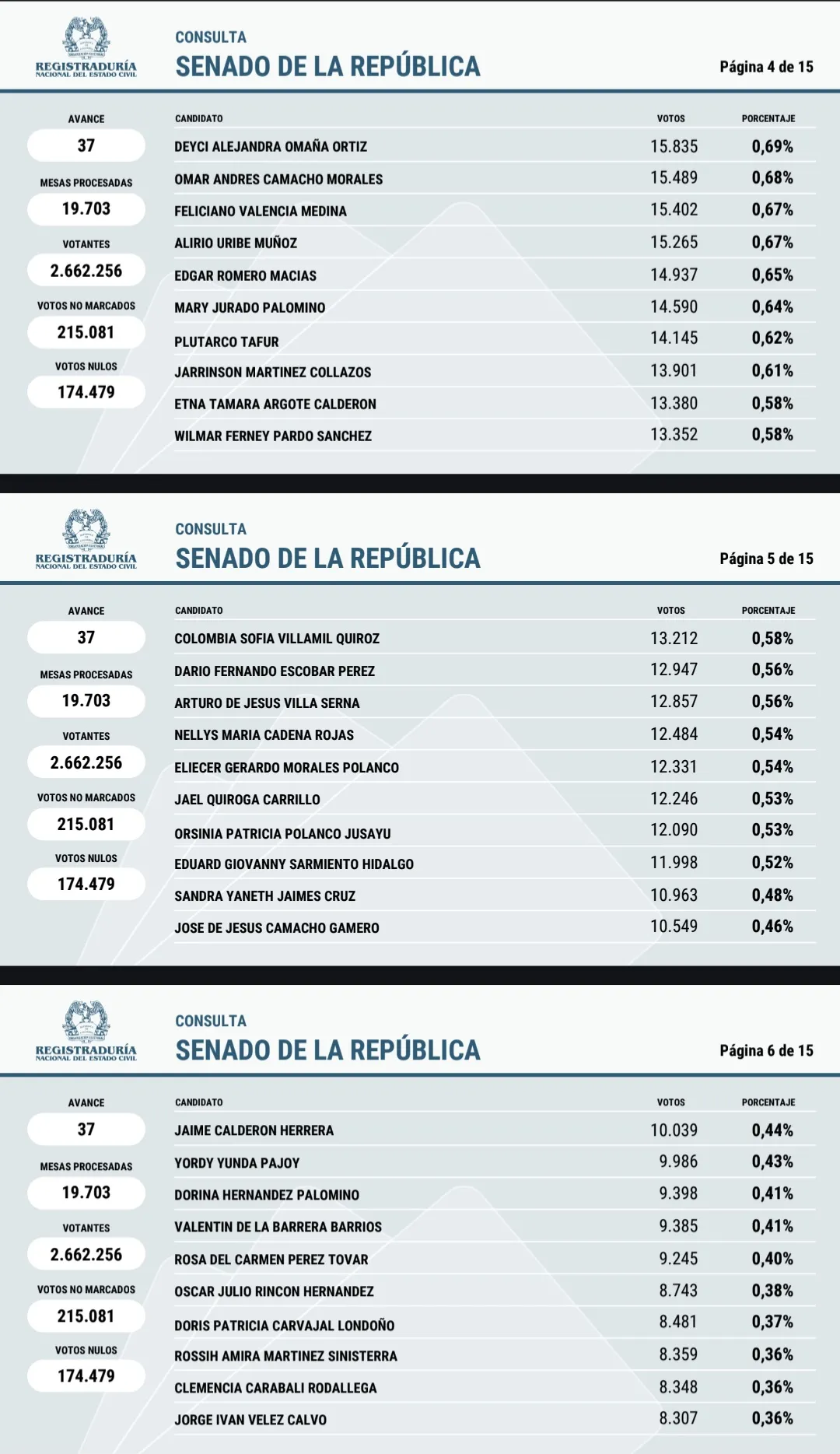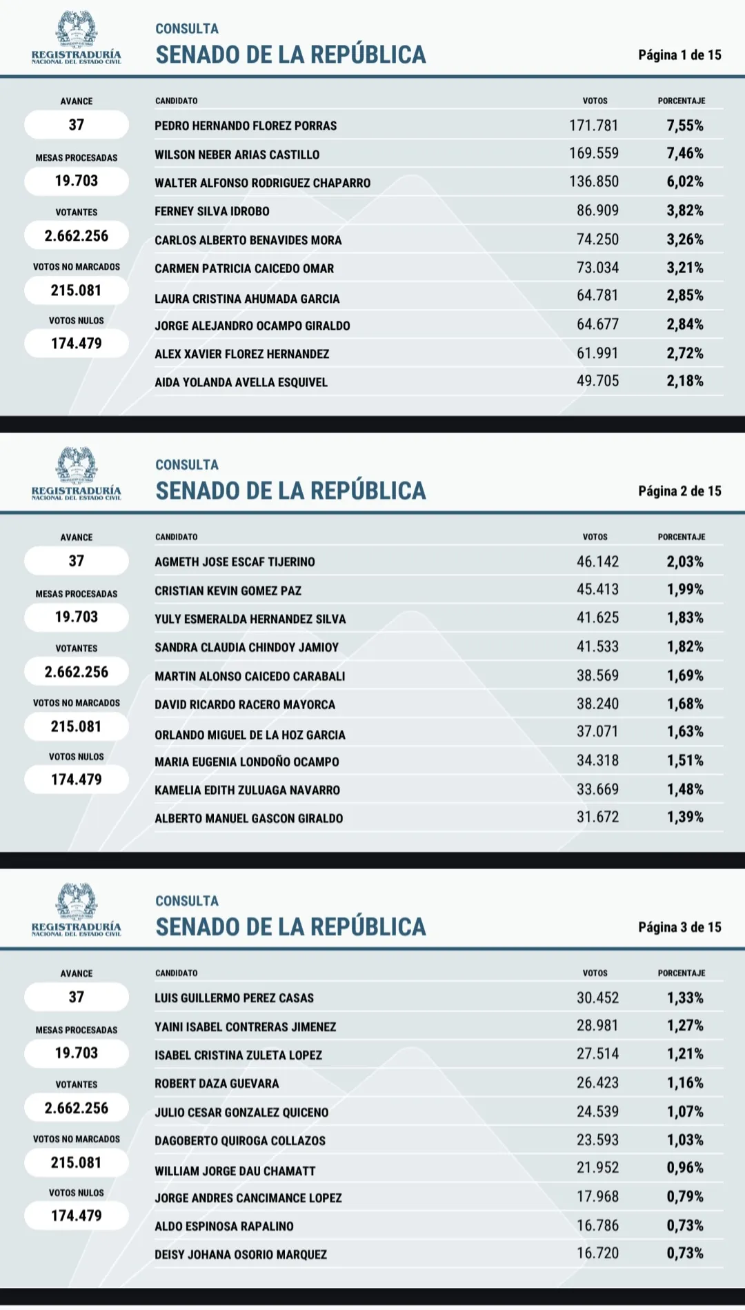 En el ámbito legislativo, el exmagistrado tolimense Luis Guillermo Pérez Casas logró 30.472 votos (1,33%), posicionándose en el puesto 21 dentro de la lista nacional para el Senado. Su trayectoria en la defensa de los derechos humanos y su labor como exmagistrado del Consejo Nacional Electoral fortalecieron su respaldo dentro del movimiento progresista.
