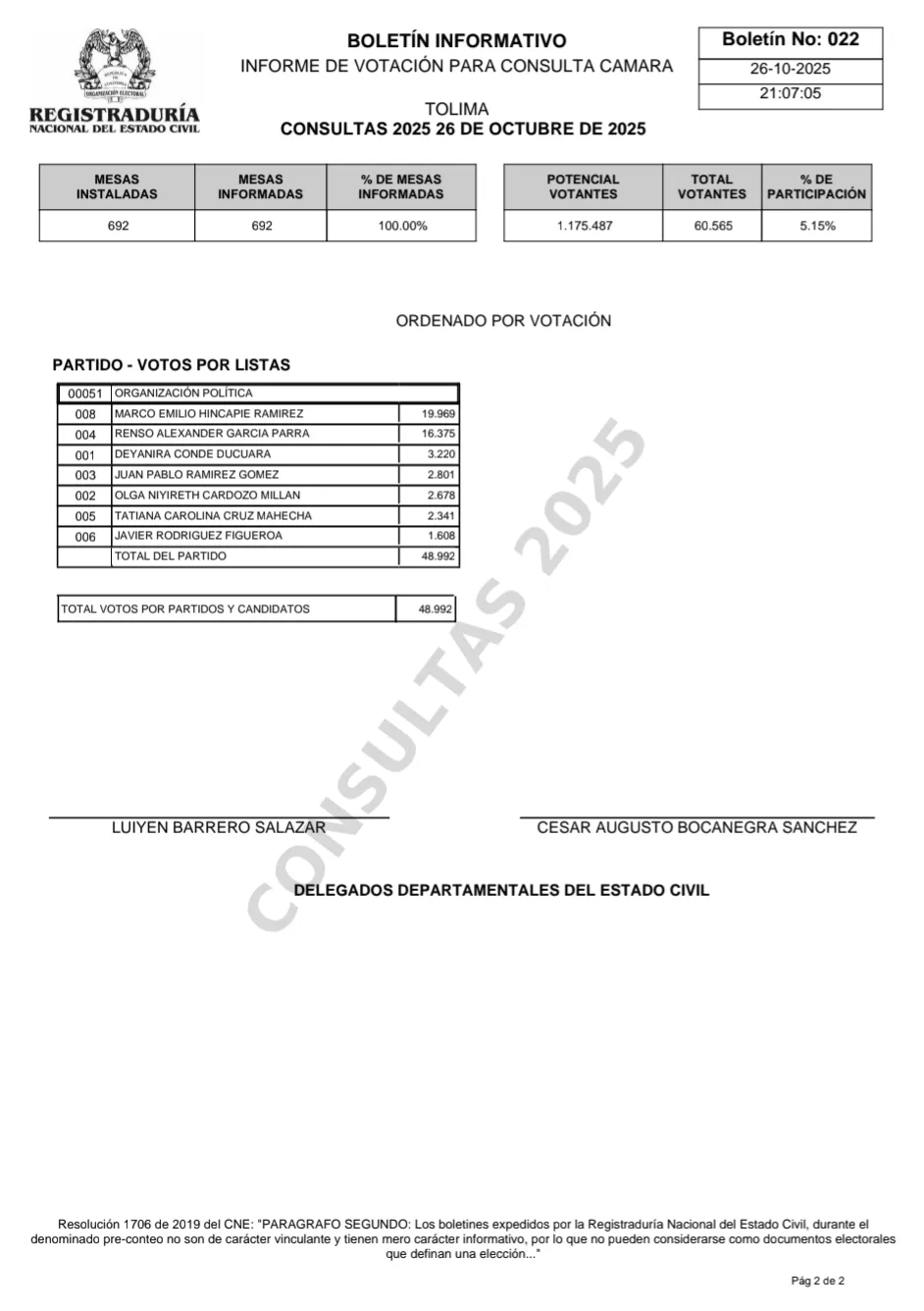 El informe registró un total de 60.565 votantes en el Tolima, lo que representa una participación del 5,15% sobre los 1.175.487 ciudadanos habilitados. Aunque la cifra es baja, las autoridades electorales destacaron el orden y la transparencia de la jornada, desarrollada en 692 mesas informadas en todo el departamento con un 100%.