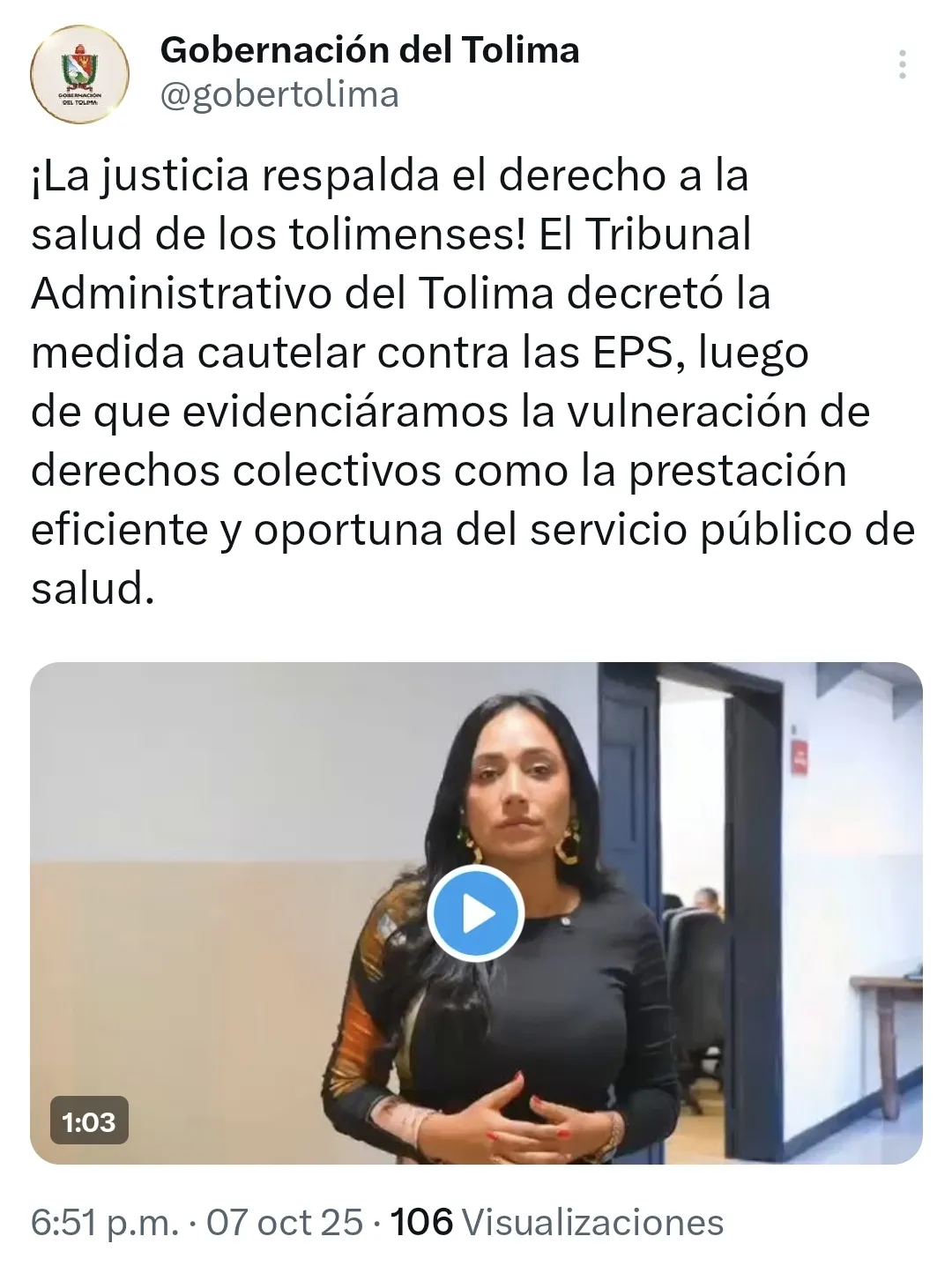 Katherine Rengifo, secretaria de Salud del Tolima, celebró la medida judicial y destacó su relevancia para la supervivencia de la red hospitalaria. Según afirmó, “este fallo es un paso fundamental para proteger el derecho a la salud y asegurar la estabilidad de los hospitales, que llevan años enfrentando una grave escasez de recursos por la morosidad de las EPS”.