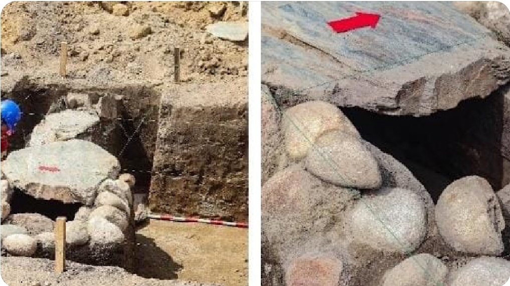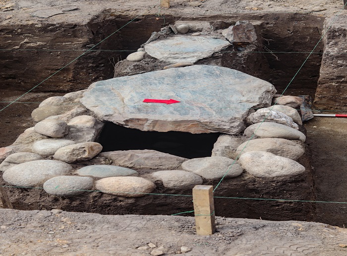 Soy alto fue producto de trabajos realizados por la retroexcavadora Jenny encontrar 70 cm sobre el nivel del suelo la gran laja de piedra que cubría la estructura funeraria.
