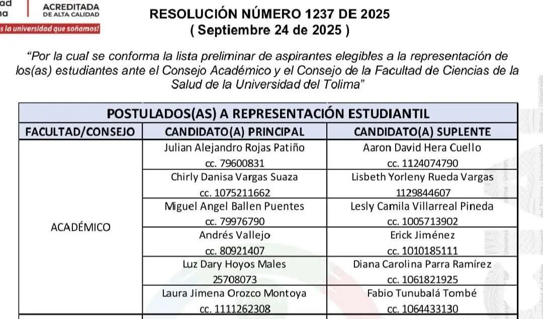 La Universidad del Tolima anunció oficialmente, mediante la Resolución N.° 1237 de 2025, la lista preliminar de aspirantes a la representación estudiantil en el Consejo Académico. Esta instancia es la máxima autoridad académica de la institución y tiene a su cargo la dirección, organización y calidad de los procesos educativos que impactan de manera directa a toda la comunidad universitaria.